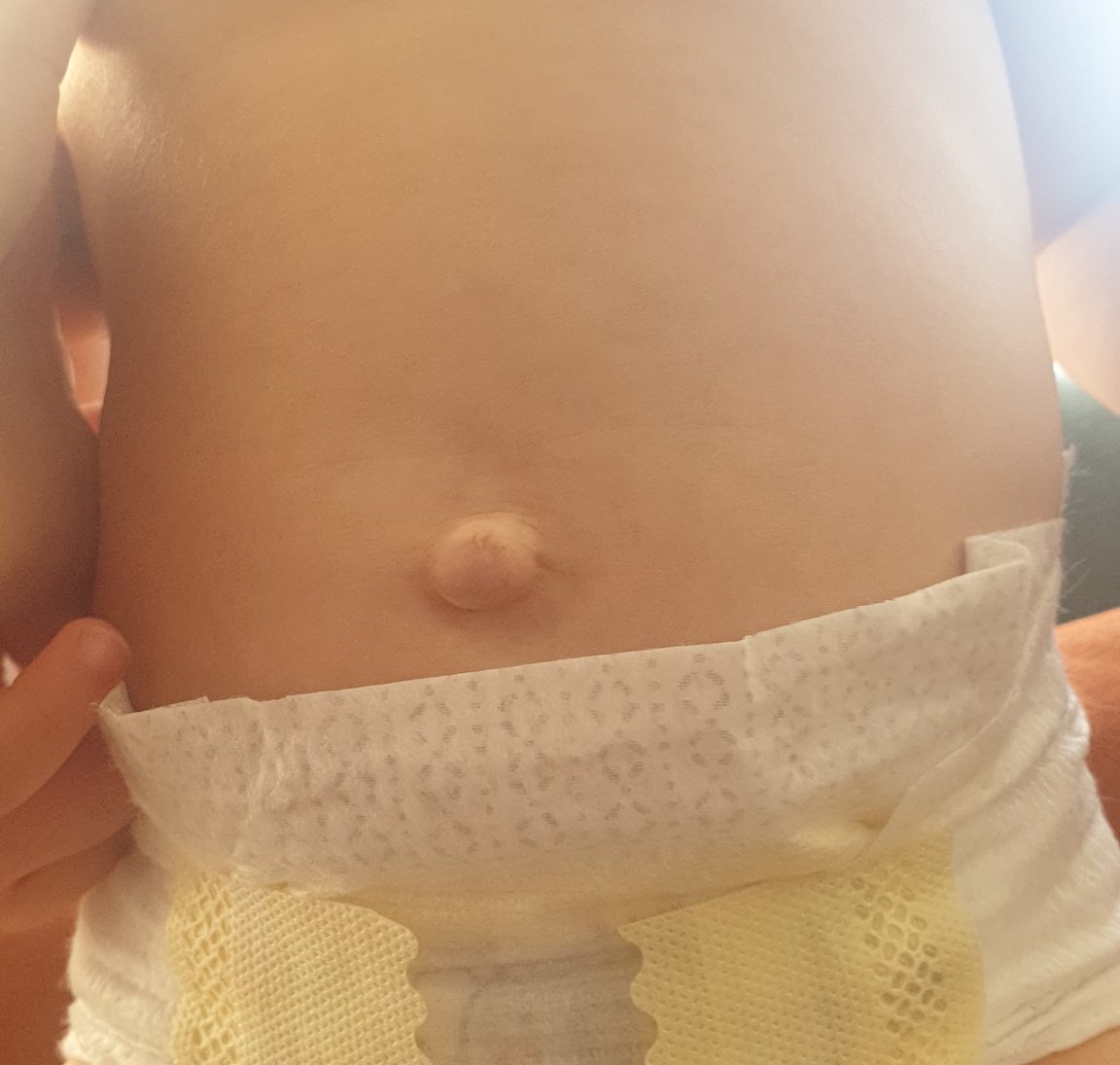 пъпчето е изпъкнало като за херния, но трябва да се провери дали има херниален отвор и колко е голям той. Във всички случаи това състояние не е спешно и изисква проследяване във времето. Тези хернии имат тенденция да се затварят спонтанно до към 5 година.