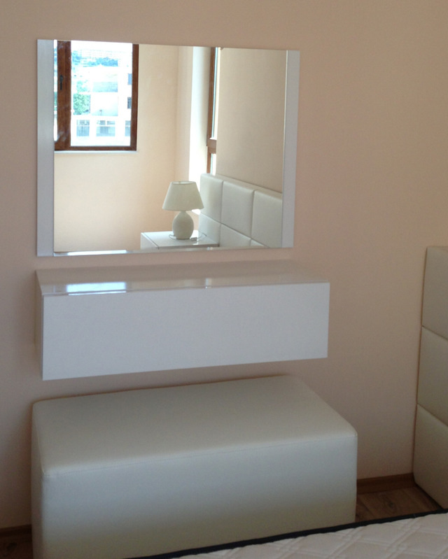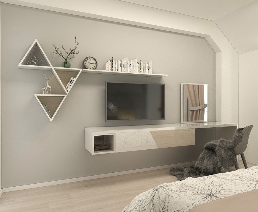 Тв модул с 2 малки шкафчета под него и мини тоалетка с възможност за слагане на малка табуретка. Общата му дълбочина е 30см и е идеален за тесни спални. Много обикалях по мебелните магазини, но не видях нищо готово. (само в Икея имаше една мострена спалня с подобен готов модул, на 40см дълбочина, но са го махнали, явно не се предлага вече)
