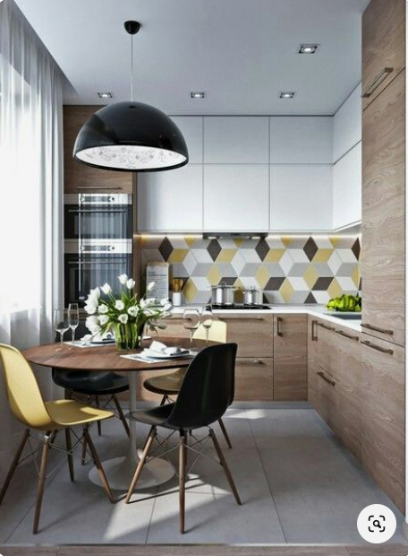 Искаме частта с напречния плот заедно с високите веритикални шкафове да преместим към дясната стена. За да може още малко да се разшири кухнята, където е хладилника и да вкараме фурната в колона до горе. Дано да сте ме разбрали. Масата ми за хранене по принцип се намира към лявата стена. Цветът на масата е подобен на тъмния цвят.