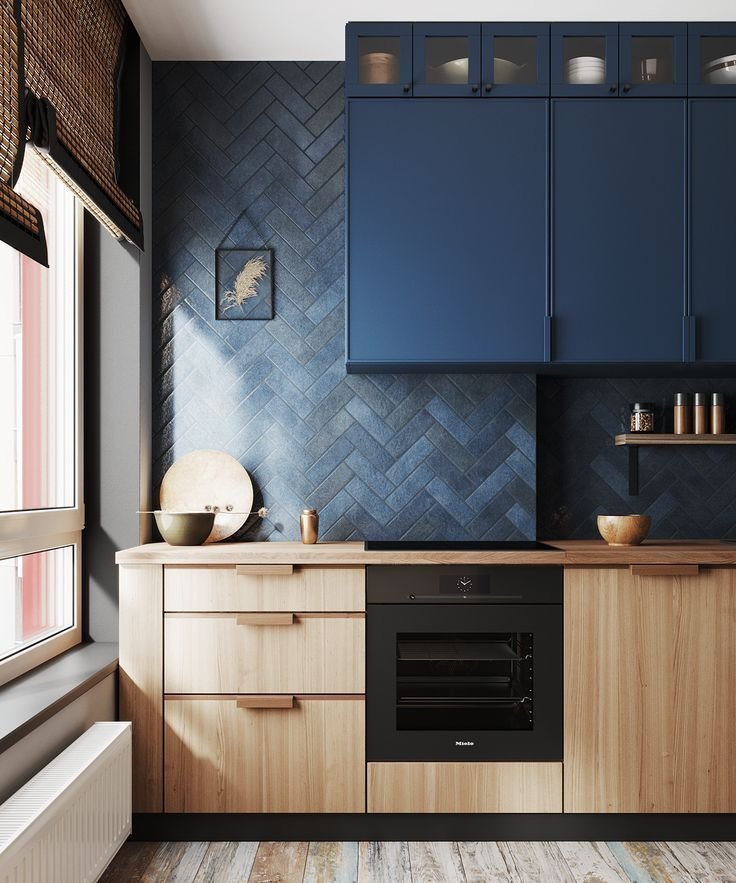 С кремаво е класика, но и много традиционно. Направете дървена кухня, цвят мляко с кафе, със синьото става убийствена комбинация. Сложете иноксови уреди и задължително интересен гръб на кухнята – много светъл от гланцови плочки, които да отразяват светлината /бялото не е задължително да е снежно/.