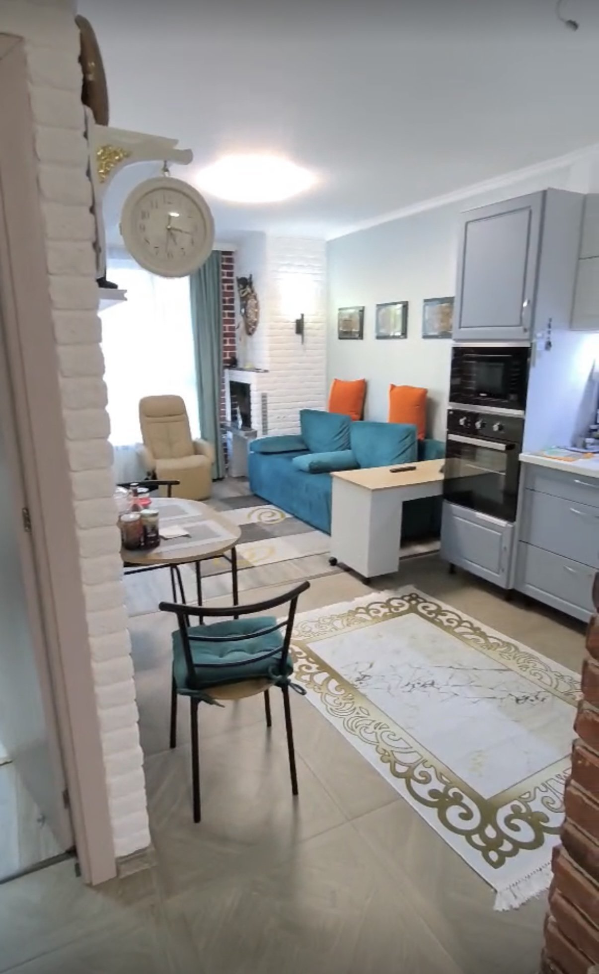Не ми харесват килими върху теракот. Оранжеви възглавнички. Може ли да снимаш и от др ъгли, виждам някакви тухлички