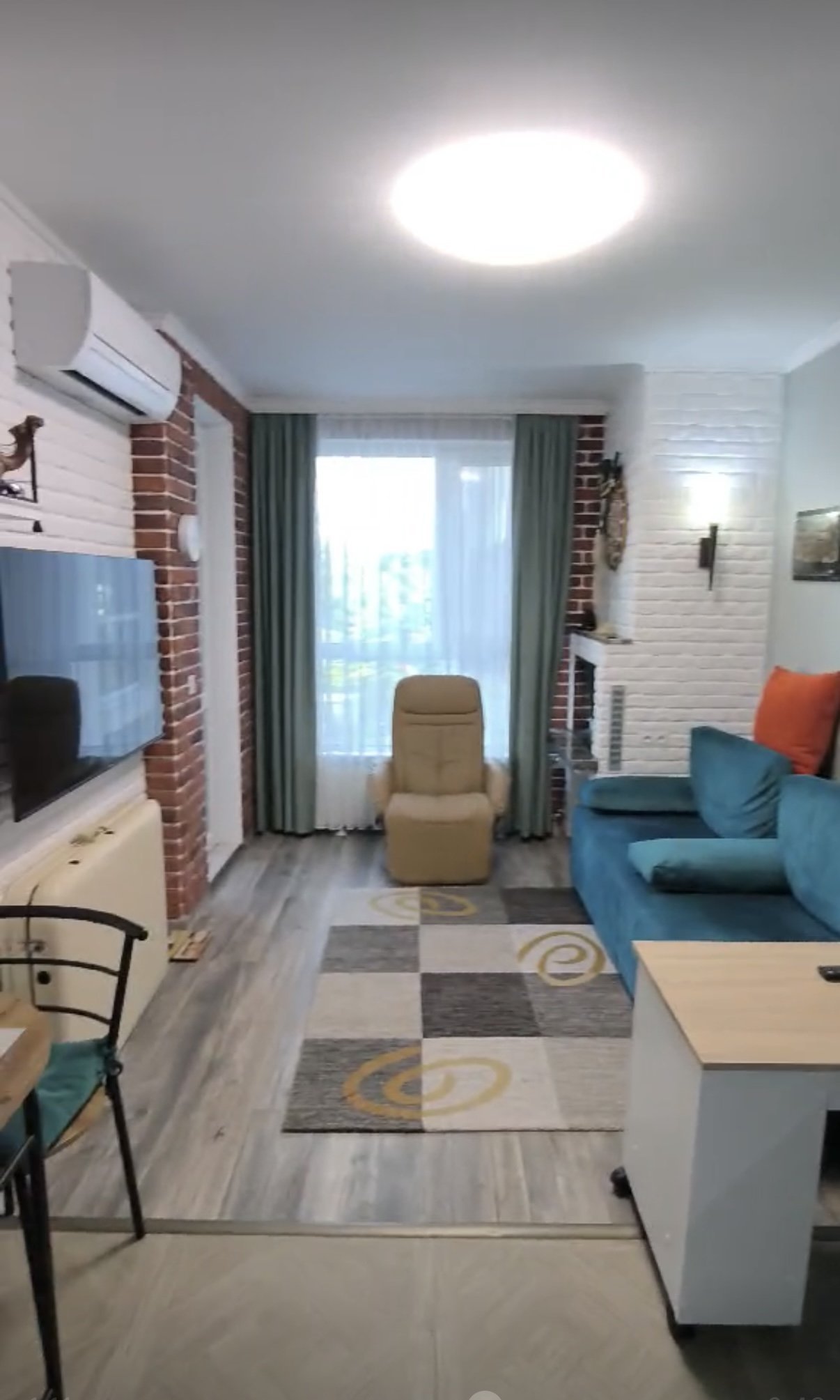 Аз бих махнала бежовите мебели, между кухнята и дивана, масата, бежовия фотьойл. Ще махна и картините, 3 картини в такова малко помещение натоварват.  И някакъв часовник, който виси, ще махна, и бухалчето... Масата в индустриален стил, не пасва на останалите мебели, но пасва на тухлите, но едва ли ще искаш да смениш дизайна на кухнята или дивана в индустриален стил? По-добре купи една солидна маса, която освен за хранене да се използва и за лаптопа и удобни столове и махни тази мебел бежовата, бюро ли е? Там ще ти се отвори, диванът ще се вижда откъм вратата, а сега е наблъскано. Ако смениш масата, нямаш нужда от зелените пердета, сложи нещо много бледо, неутрален цвят, че дори много бледо сиво, защото червените тухли не можеш да ги махнеш, те ще ти стоят за акцент, и на влизане в помещението имаш още тухли, че и на стената срещу прозореца може да има. Така ще се подчертае шарката на паркета и няма да е скучно без зелените пердета.