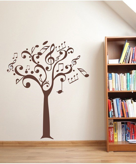 аз бих сложила стикера с клавишите на колоната (страната към стаята) , дървото не е необходимо, но щом си обещала, сложи и него, какви други мебели ще има?
