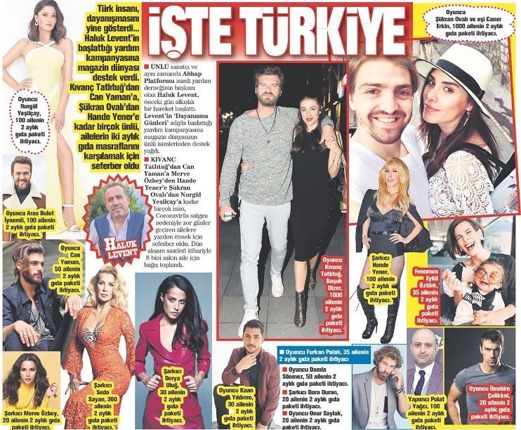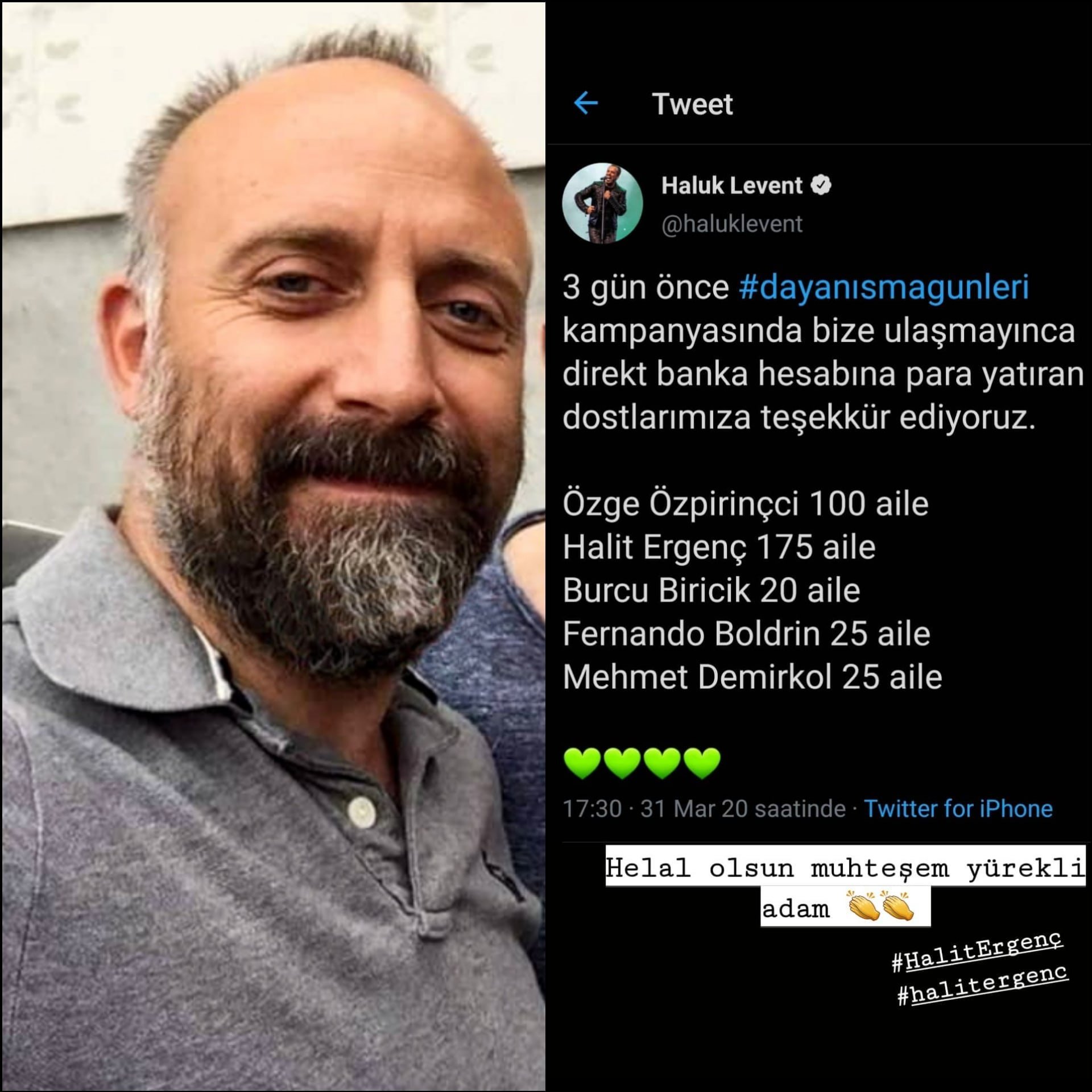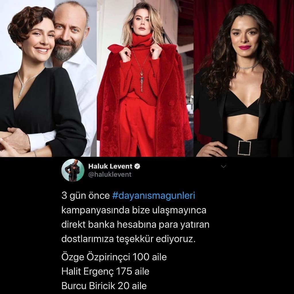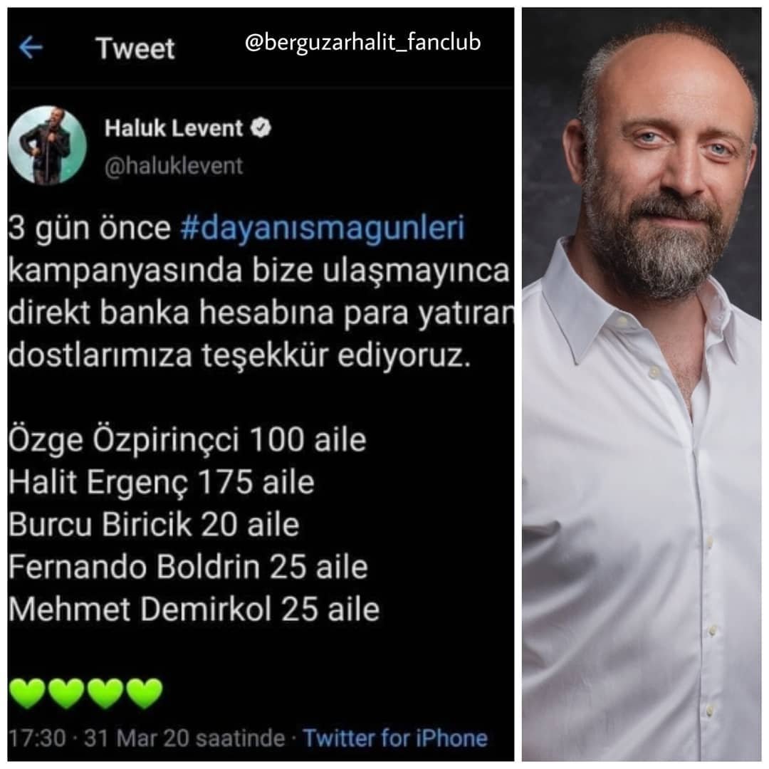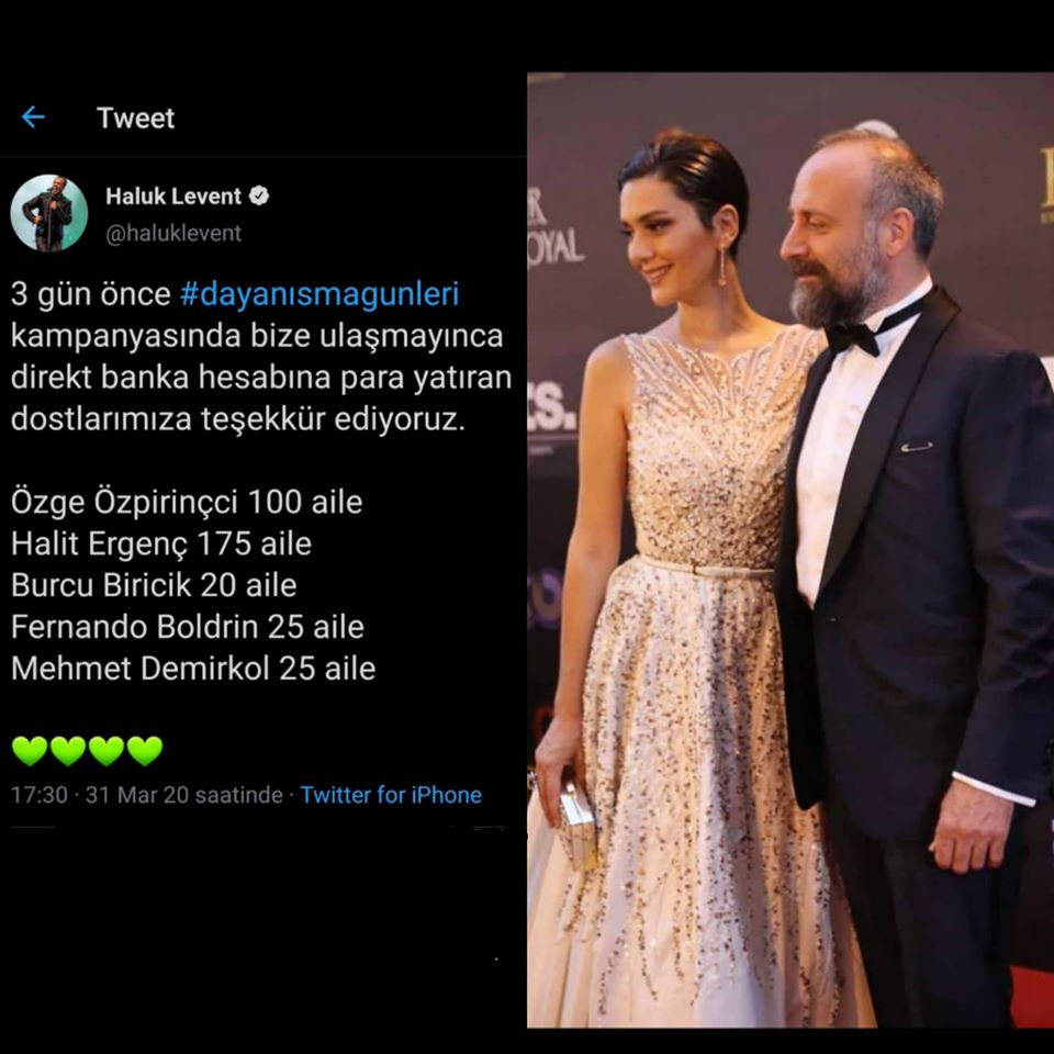 Преди три дни музикантът и певец Халук Левент сложи началото на благотворителна кампания "Дни на солидарност" за помощ на бедни семейства по време на епидемията. Включиха се много на брой известни личности - актьори, музиканти, спортисти, сред които и Халит. Внесъл е сума за подпомагане на 175 семейства, а в съобщението от Халук от днес са имената на още няколко актьори.