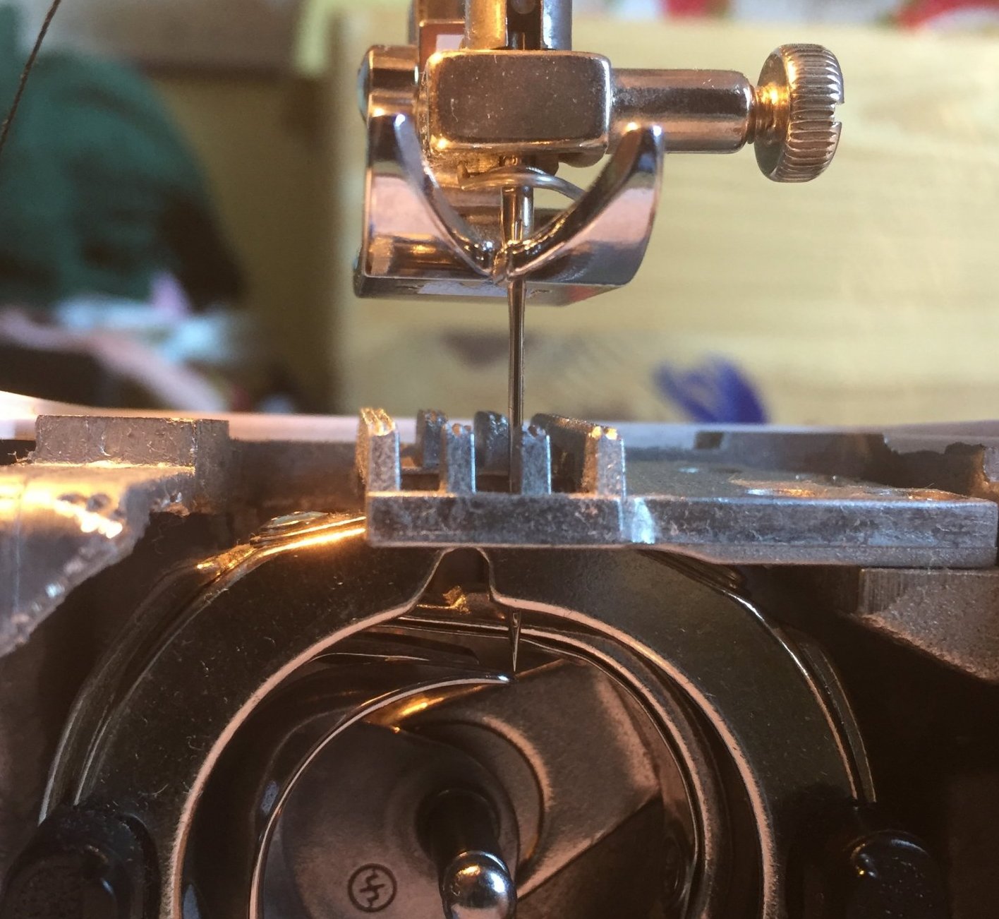 Казва му носик челнока, което значи нослето на грайфера. На десният такт, този носик трябва да е на един милиметър над отвора на иглата. Вижда се идеално. Ако е по-нагоре, смъкни иглата дотам, но ако е по-надолу ще трябва да се вдига иглодържача. Направи това и снимай твоето положение в момента, както показва този мастер да видим ние что произходит с тази караджейка!