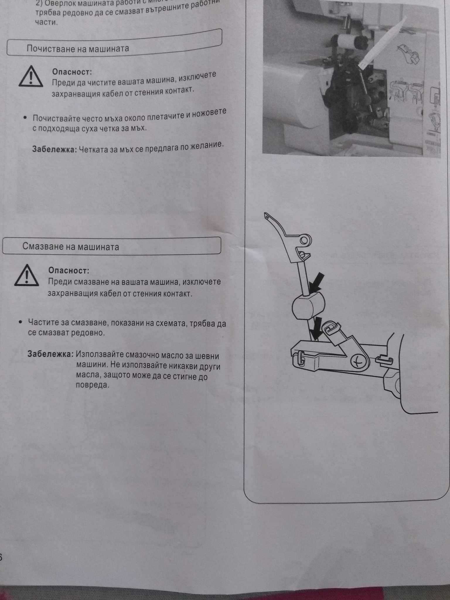 Здравей, yuleto1! Трябваше да кажеш оверлогът е чисто нов, или е втора ръка, за да не гадая. Ако е нов, смазването трябва да стане в зависимост от шиенето. Добре е да се смазва на 24 РАБОТНИ ЧАСА. Ако шиеш от дъжд на вятър, добре е да го смазваш основно поне на една година. Нарисуваното смазване е смехотворно, защото отговорните места за смазване са не по-малко от 50. Тези на рисунката трябва по-често да се смазват, примерно на два - три месеца, а ако не те мързи след всяко шиене. Как произходит всичко това? Избираш слънчев ден и на терасата поставяш стара кърпа на масата! РАЗДЯВАШ ВСИЧКИ КОНЦИ! Ако денят не е слънчев, вземаш един челник, или нощна лампа и започваш да развиваш винтовете! Ако не можеш да помниш снимаш и поставяш по двойки както си ги развила, но на различни места, както са на машината. Трябва ти голяма кръстата отвертка. Не е трудно и с достатъчно търпение, ще махнеш всички капаци. Можеш да поставяш винтовете в капаците. Машината ще е цяла целеничка, а не като Брадър. Вземаш някаква четка и много педантично изчистваш всички мъхове! Купуваш си масло за шевни машини, а не с някое за което са казали, че става! Не става! Завърташ машината на ръка и гледаш къде има въртене, триене, плъзгане и капваш по една - две капки. Като я смажеш, поставяш куплунга и завърташ на ниски обороти! След това натискаш на пълни обороти. Добре е това да става на място с плочки, защото може да опръска с масло. Попиваш излишните капки масло! Поставяш капаците и завиваш винтовете. Ако не е смазвана дълго време, ще чуеш разликата.
