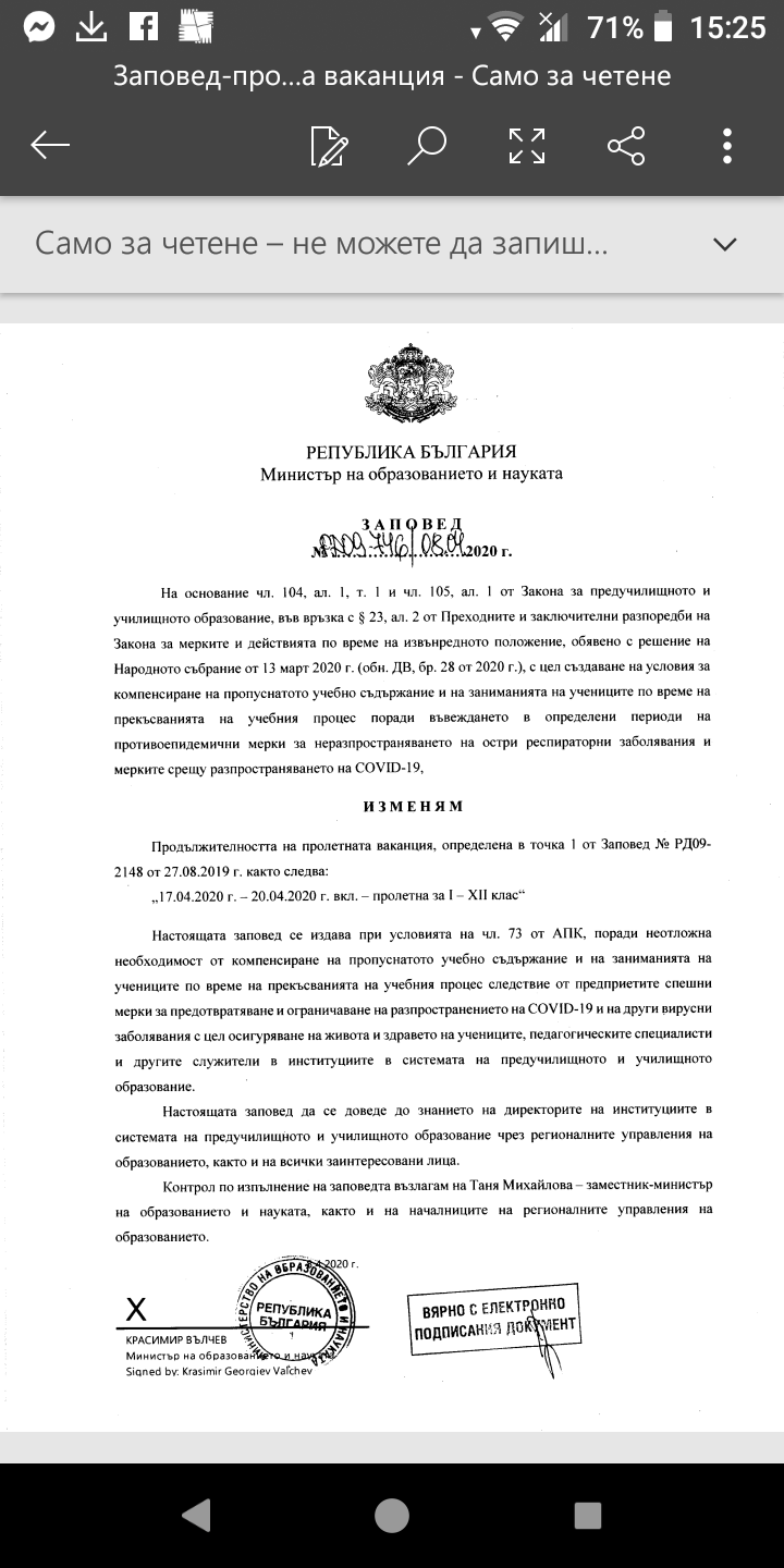 Има заповед за ваканцията. Ще бъде само петък, сб, нед и понеделник, колкото са великденските празници. Вчера ни го пуснаха на сайта на училището.