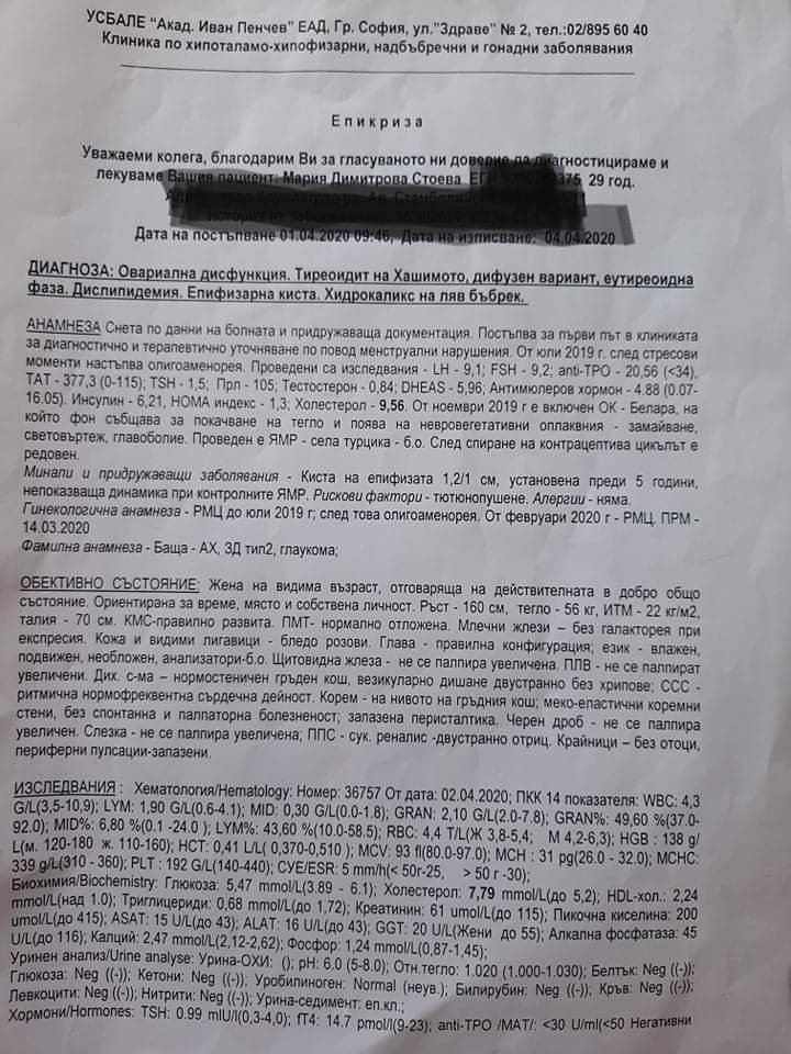 Здравейте! Какво бихте ме посъветвали, тъй като съвсем наскоро ми съобщиха диагнозата, а нямам назначено лечение. Единствено приемам Профихол по 1тбл след хранене вечер. Благодаря предварително! Прилагам епикризата! Основен проблем бе липсата на цикъл след лечение с белара 21+7 и С-фем, без подобрение, качване на кг и ..така стигнах до Майчин дом...където ми казаха за Хашимотото...моля за съвет, насоки...не съм изследвала витамини и не приемам такива..хормон също не ми е изписван.