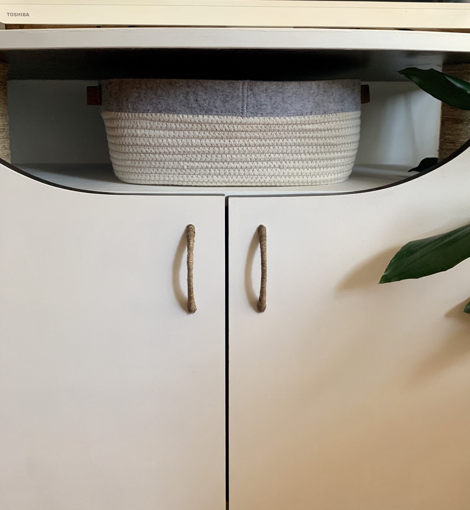 Стъпките са следните - съвсем леко шкурене, грунд, боя на водна основа и матов прозрачен лак също на водна основа за боядисването. Използвах останалата боя от масата на Ани и взех обикновена акрилна за местата, които не са толкова видими. Има доста забележки, но като цяло съм доволна. Отне доста време и нерви 😁. Има по 3 ръце минимум. Дръжките на вратичките са омотани с конопена връв.