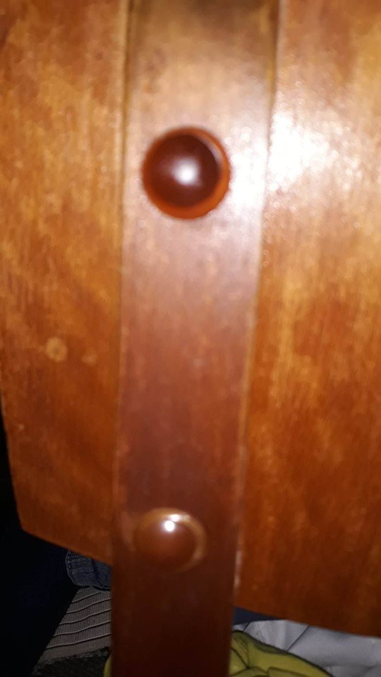 Кръглите издутини които се виждат най-вероятно са капачета залепени върху болта. За по естетичен вид и на съвременните талашитени мебели слагат такива. С нещо остро с тънък връх опитайте да свалите, ако са залепени лепилото би трябвало да е остаряло и станало чупливо. Има вероятност и да са набити в дупката, опитайте да ги свалите.