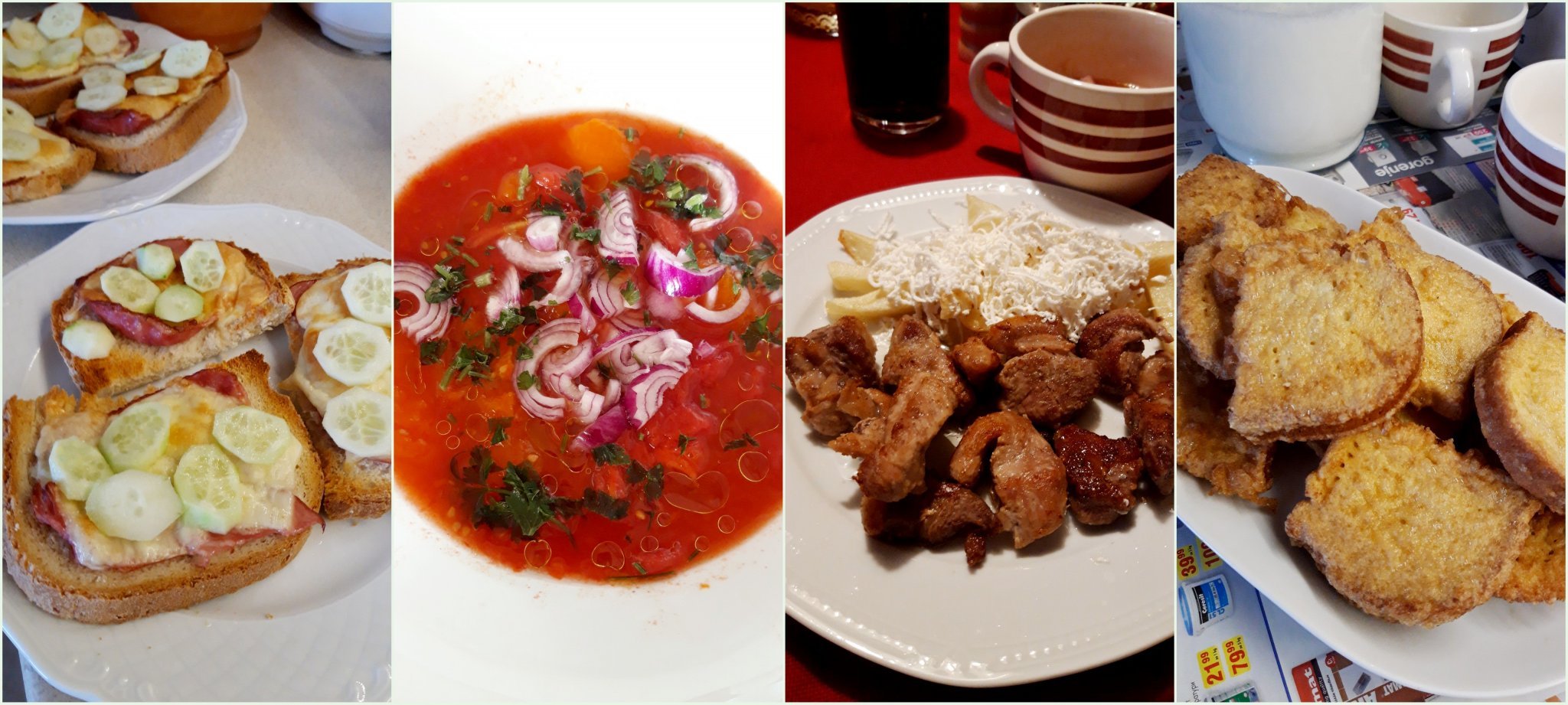 Сандвичи; доматена салата от буркан; друсан кебап и ПКС; от днес пържени филийки