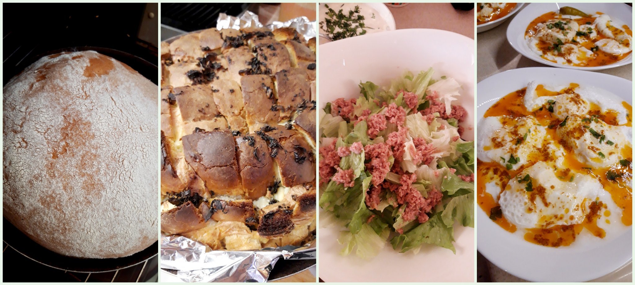 Домашно хлебче запечено с кашкавал, чесън, масло и подправки; яйца по панагюрски; зелена салата с риба тон