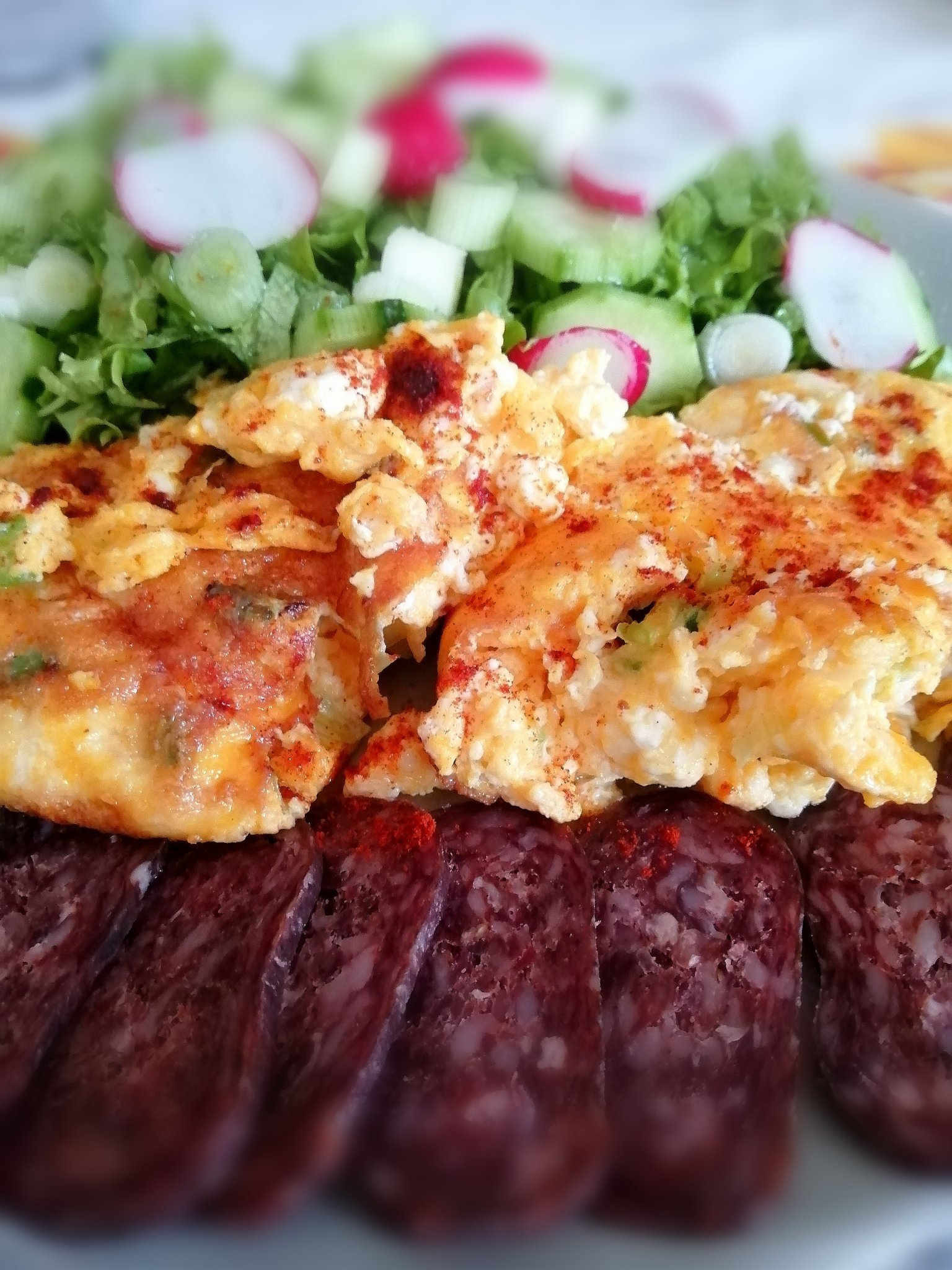Днес за вечеря на Джастев приготвих: свежа салата, омлет с пресен лук и сирене и малко мезенце. Аз ще карам на разтоварване Grinning :