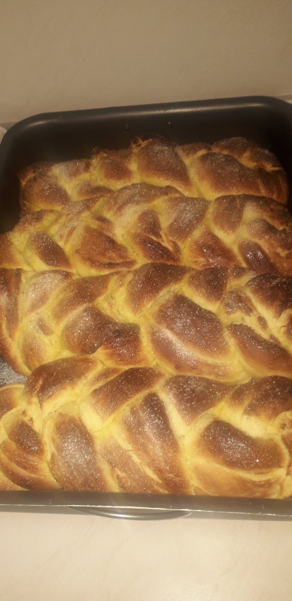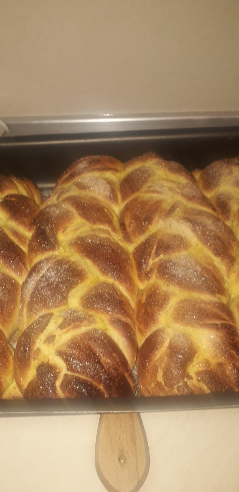 Яйцата - боядисани , моите са повече в червено, така обичам. Козунаци основни  - събота, като ще започна късно вечерта от петък. |Видях се без работа и сътворих един Многолистен Бриош , то си е пак козунак, ама не съвсем, но този специално си имаше много работа, т. е. измесване му е майката и е с квас, а квас взех от приятелка, щото аз не го отглеждам. Мнооого е хубав, раздадох го веднага на децата. Оценен беше! Изчезна, вече няма.