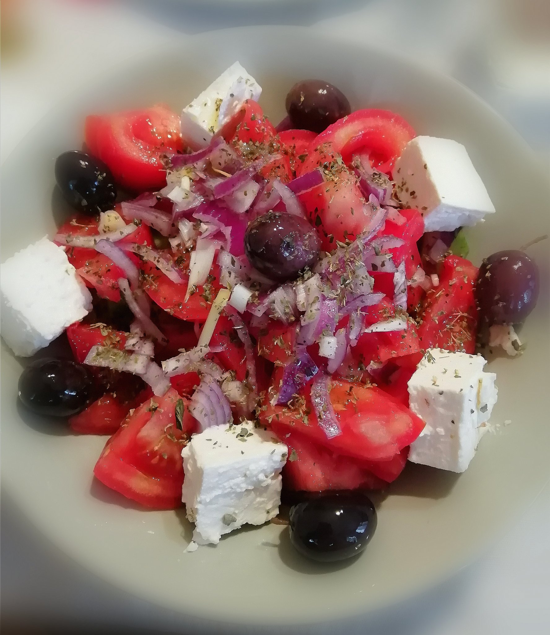 От мен една салатка по гръцки с риган и зехтин(под доматите има и краставички) :