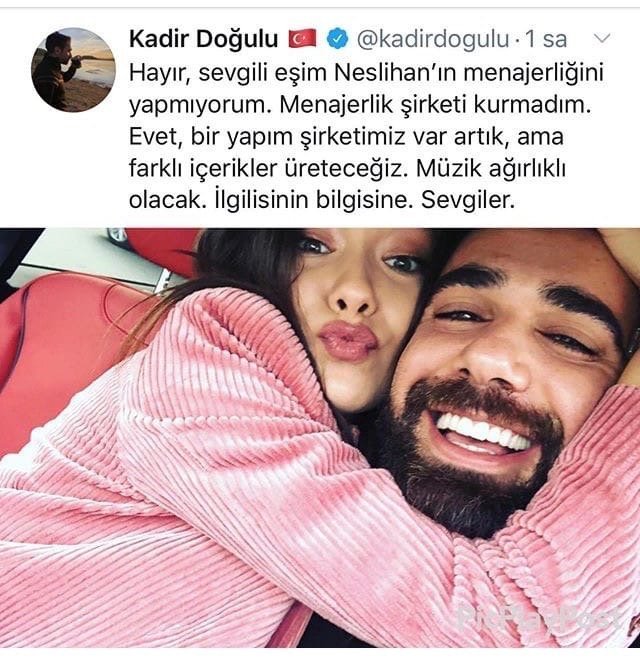 Не, няма да съм менажер на любимата си съпруга Неслихан. Не съм създал менажерска фирма. Да, вече имаме продуцентска фирма, но ще произвеждаме различно съдържание. Музиката ще бъде преобладаваща. Поздрави.
