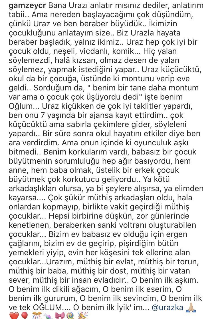 Казаха ми, можеш ли да ни разкажеш за Ураз? Ще разкажа, разбира се. Но се замислих откъде да започна, защото ние с Ураз израснахме заедно. Нека ви разкажа за детството на нас двамата. С Ураз заедно започнахме живота, двамата сами. Ураз винаги е бил много добро дете, весело, съвестно, смешно. Когато Ураз беше малък, в училището даде палтото си на едно дете и се прибра вкъщи. Когато го попитах, ми каза: "Аз имам друго палто, но на това момче му беше толкова студено.“ Ето това е синът ми. Той правеше много добри имитации и когато беше малък го регистрирах в агенция, когато беше на 7 години. Беше много малък, но търпеливо отиваше да снима. Направи това, което каза. По-късно, когато беше в училището, ми каза, че прави прекъсване. Но любовта към актьорството в него не беше свършила. Имах страхове, отговорността да отглеждаш дете без баща винаги е голяма. Беше много страшно да бъдеш и майка, и баща, а също и да отглеждаш момче. Ами ако има лоши приятели или ако свикне с нещо? Слава Богу, че имаше страхотни приятели, все още страхотни деца. Че не е скъсал с тях, всички се обичат един друг Прекарваха времето в нашия дом без баща и и изяждаха всичката храна, която приготвях. Имаше деца по всички ъгли на къщата. Мой Ураз, страхотно дете, страхотен внук, страхотен баща, страхотен приятел, голям родолюбец, страхотен син. Моята първа любов. Той е първото ми засадено дърво, първата ми работа, първата ми гордост, първата ми радост. Той е първият ми и единствен син. Той е първият ми, добре че те имам @urazka