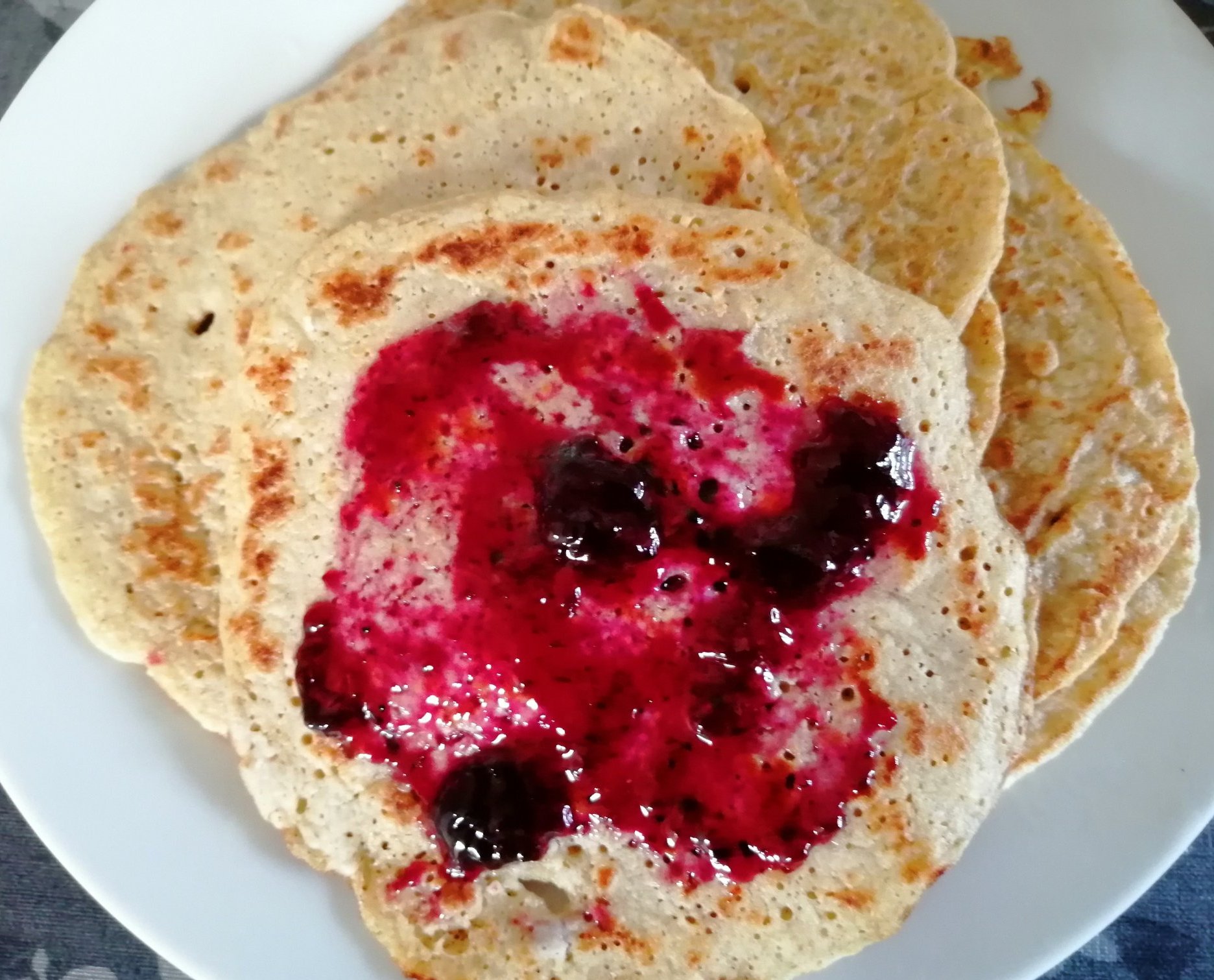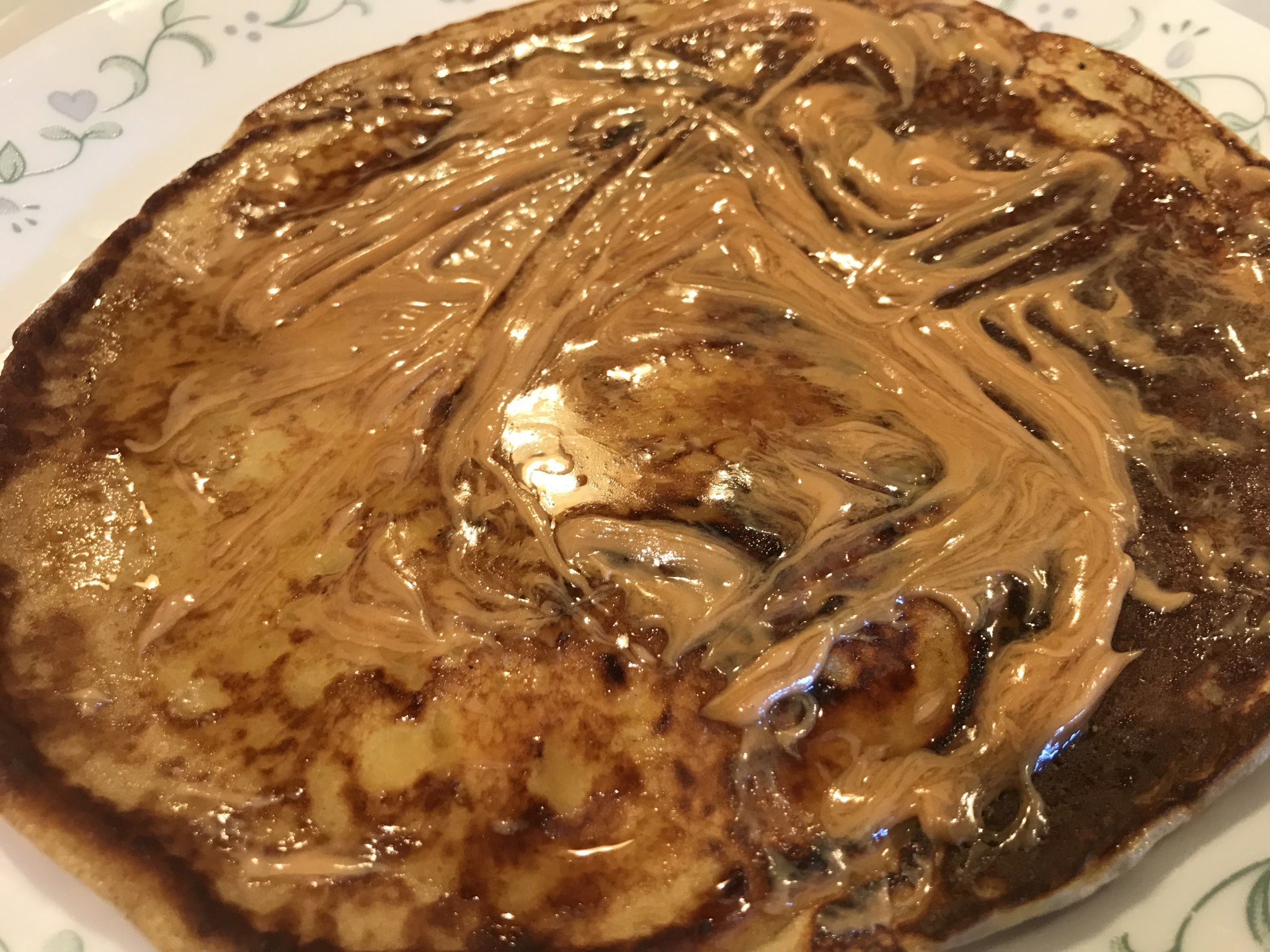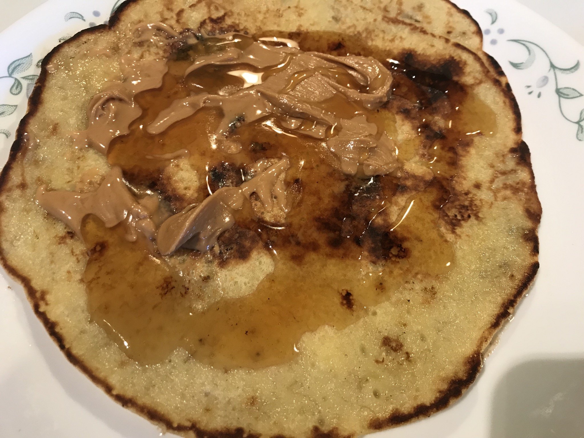 И от мен палачинки, но много големи (тип пенкейкс) със скрит намачкан банан (че детето не яде иначе банани), фъстъчено масло и мед.