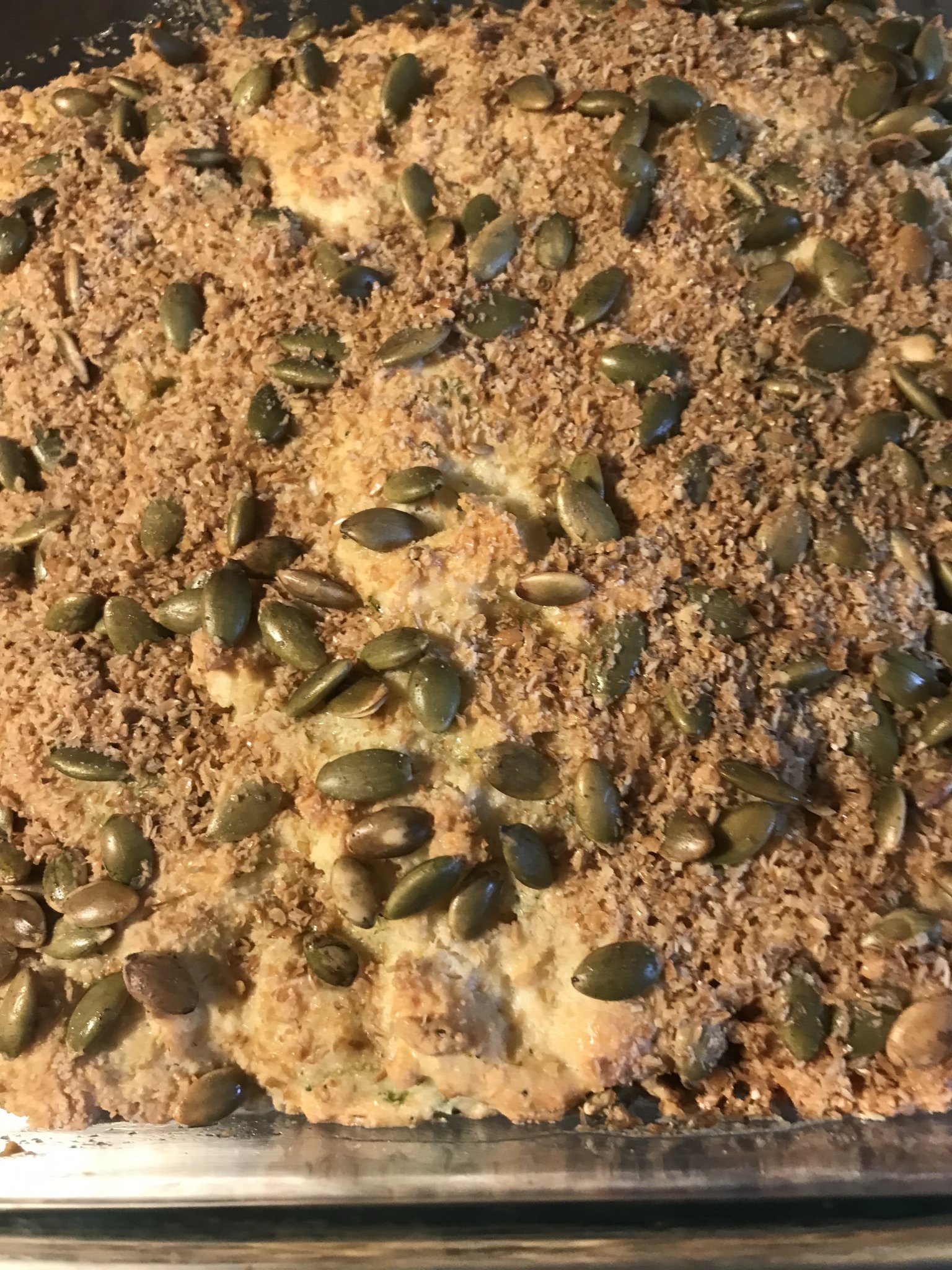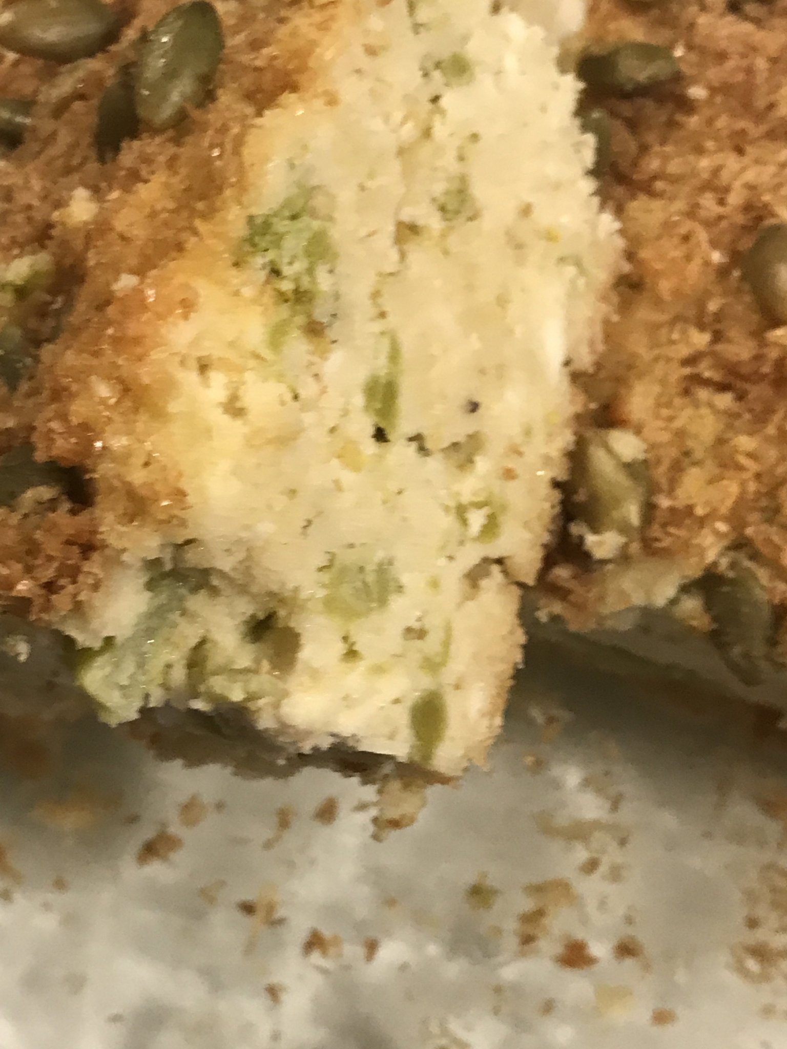 От мен един хляб, ама не баш - бадемово брашно, яйца, броколи, козе сирене, кокосово масло, бакпулвер, малко тиквени семки и ленено семе за поръсване. Ядохме го намазан с крема сирене и много зелена салата.