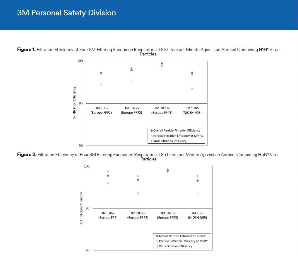 Тестове на маски FFP2, FFP3 и N95. Маските са тествани с аерозоли съдържащи грипни вируси. И двата вируса са с размер около 0,1 микрон колкото е и корона вируса. Аерозолите са били с размер между 0,01 и 0,5 микрона.