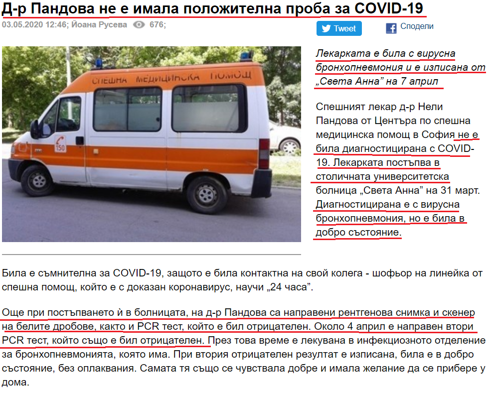 "Единствената положителна проба за COVID-19 на д-р Пандова е излязла след бърз тест, направен при приемането й в спешното на Александровска болница, малко преди да почине. Взета й е проба и за РСR, който по инфоpмация на „24 часа”, cъщо е отрицателен, но оциално потвърждение за това все още няма. "