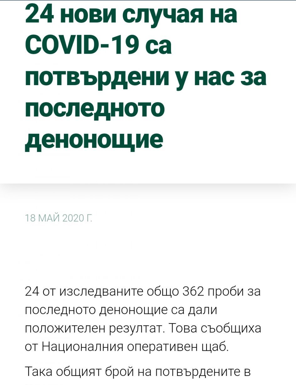 Съгласна съм с това,че при толкова направени теста,няма как да се даде обективна оценка.Пък камо ли както водещата от Нова тв с усмивка каза,че вървим към край на пандемията,щом имаме 6 заразени.Хора са,почиват и те понякога,но резултатите трябва да се тълкуват обективно,а не интерпретирано.А защо не сте доволни,че съобщиха броя на направените тестове?По-добре ли е да се заблуждаваме,че вървим съм тенденция за изчистване?Аз си обяснявам броя на хората,които са на болнично лечение така: Те са си в болница,там са тествани положително и затова ги обявяват като лежащи в лечебно заведение.Миналата седмица Кантарджиев каза,че в почивните дни се тества предимно в болници-персонал+пациенти,тъй като РЗИ почиват.