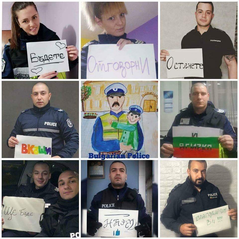 Полицаите, които също са на първа линия в борба с коронавируса, отправиха трогателно послание. Облечени в униформи, органите на реда от София, направиха колаж с техни снимки. Всеки един от тях държи лист с дума. Посланието, което се образува е „Бъдете отговорни. Останете вкъщи и всичко ще бъде наред. Благодарим Ви!".