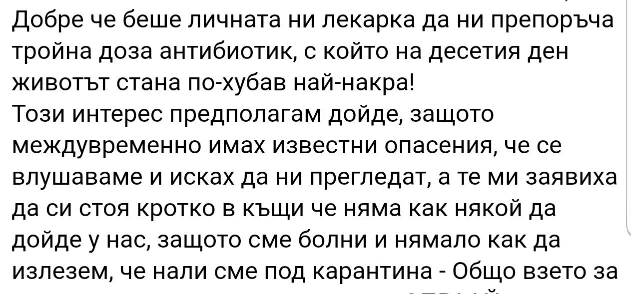 Някои не звучи да си е вършил добре работата или поне лично за себе си се надявам да имам повече възможности от това да си стоя кротко у дома и да си пия хапчетата изписани по телефона. Преглед не може да се случи, невъзможно е..