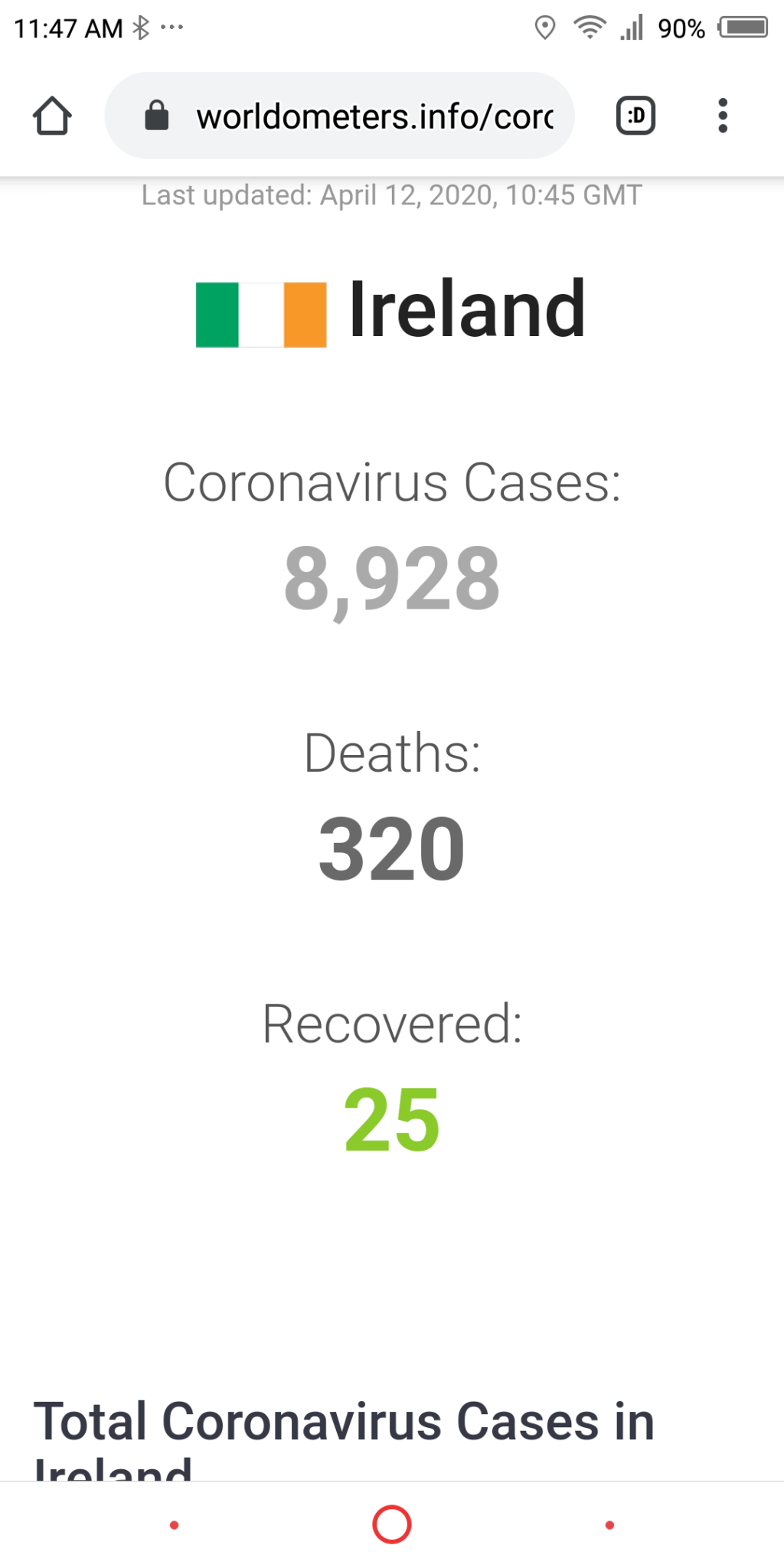 В Ирландия рекорден брой 553 новорегистрирани случаи и 33 починали за последното денонощие. Към тях ще бъдат добавени още 286 нови случая от тестове правени в Германия. Между 25 000- 30 000 тестове са изпратени за анализ в Германия, поради недостиг на тестове и реактиви в Ирландия. Строгите карантинни мерки се удължават с още 3 седмици и половина до 5 май.