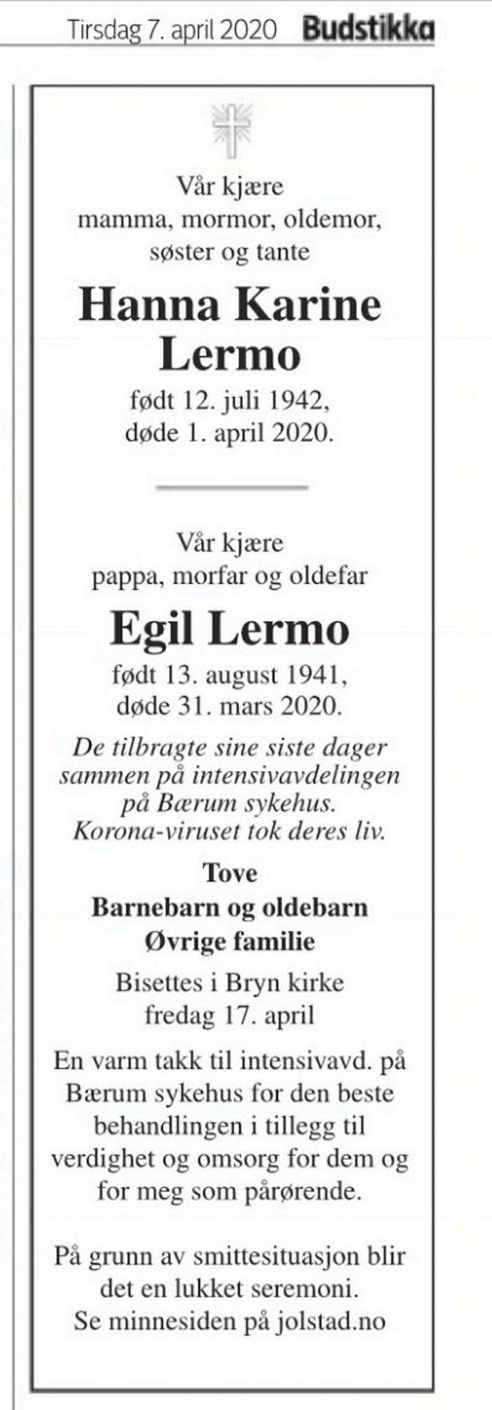 Текстът в некролога казва, че са прекарали последните си дни в интензивното в Bærum sykehus, която е голяма болница във Викен регион, който е сред най-засегнатите. И благодарности на персонала. Умрели от ковид вирус. И закрита церемония заради вируса.