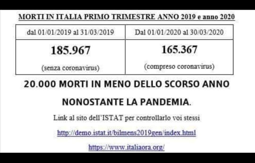 Ето сравнение на смъртните случаи за януари-март 2019-2020 в Италия Ив частност за извадка от 1081 общини. Всичко с връзки към ИСТАТ. Точно за опровергаване на фалшиви новини, като разпространяваните тук.