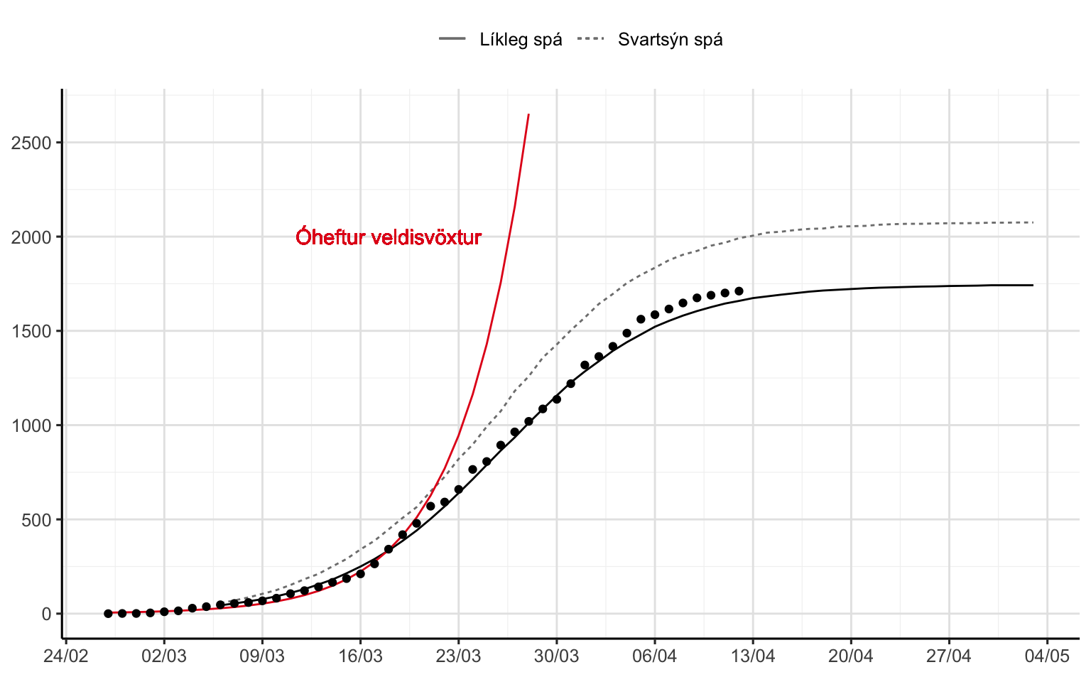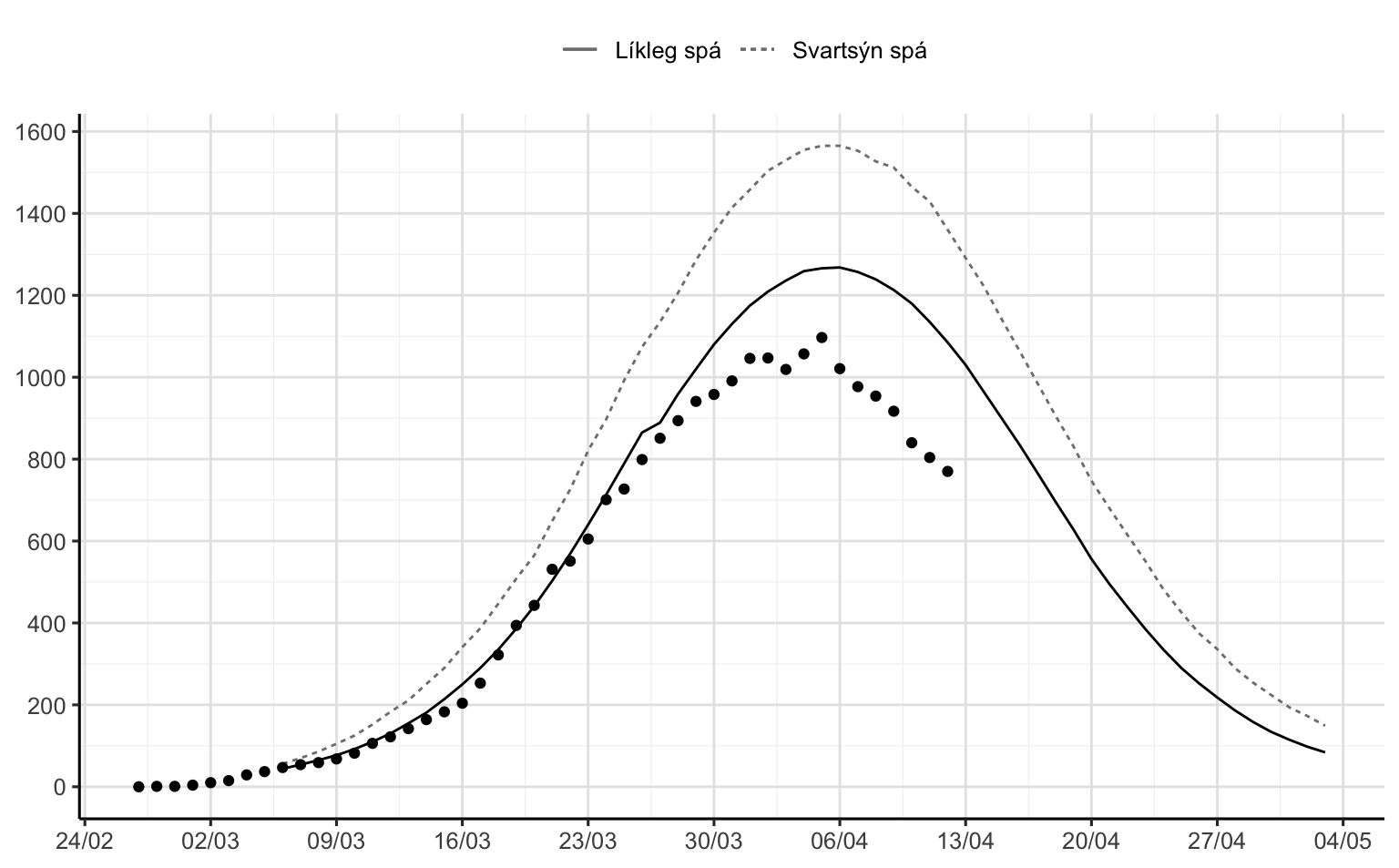 Положението в Исландия към днешна дата. Пикът на активния брой заразени го минахме и вървим надолу. По този показател (активни заразени) релността се оказва по-добра от очакваното. (Черната линия - по-вероятната прогноза,  прекъснатата линия - песимистична прогноза, черните точки - реалността).