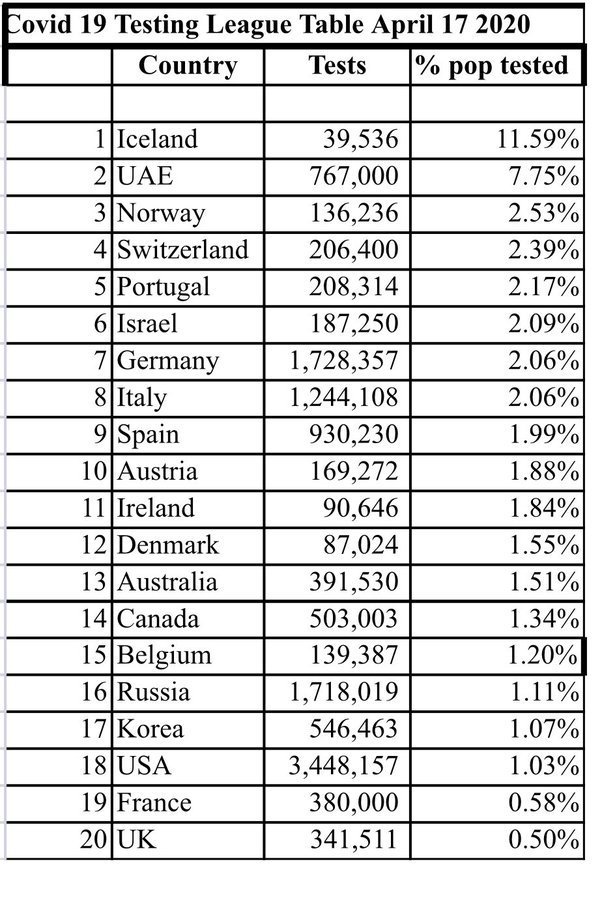 Брой тестове в някои държави и в проценти от населението :