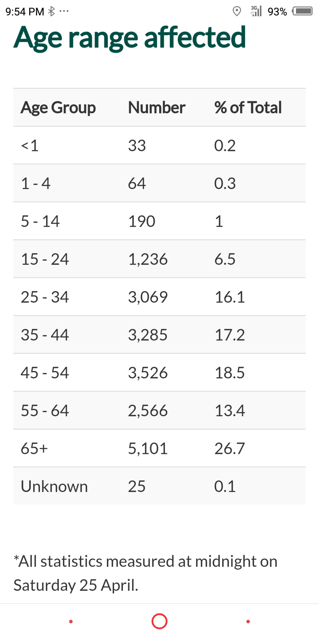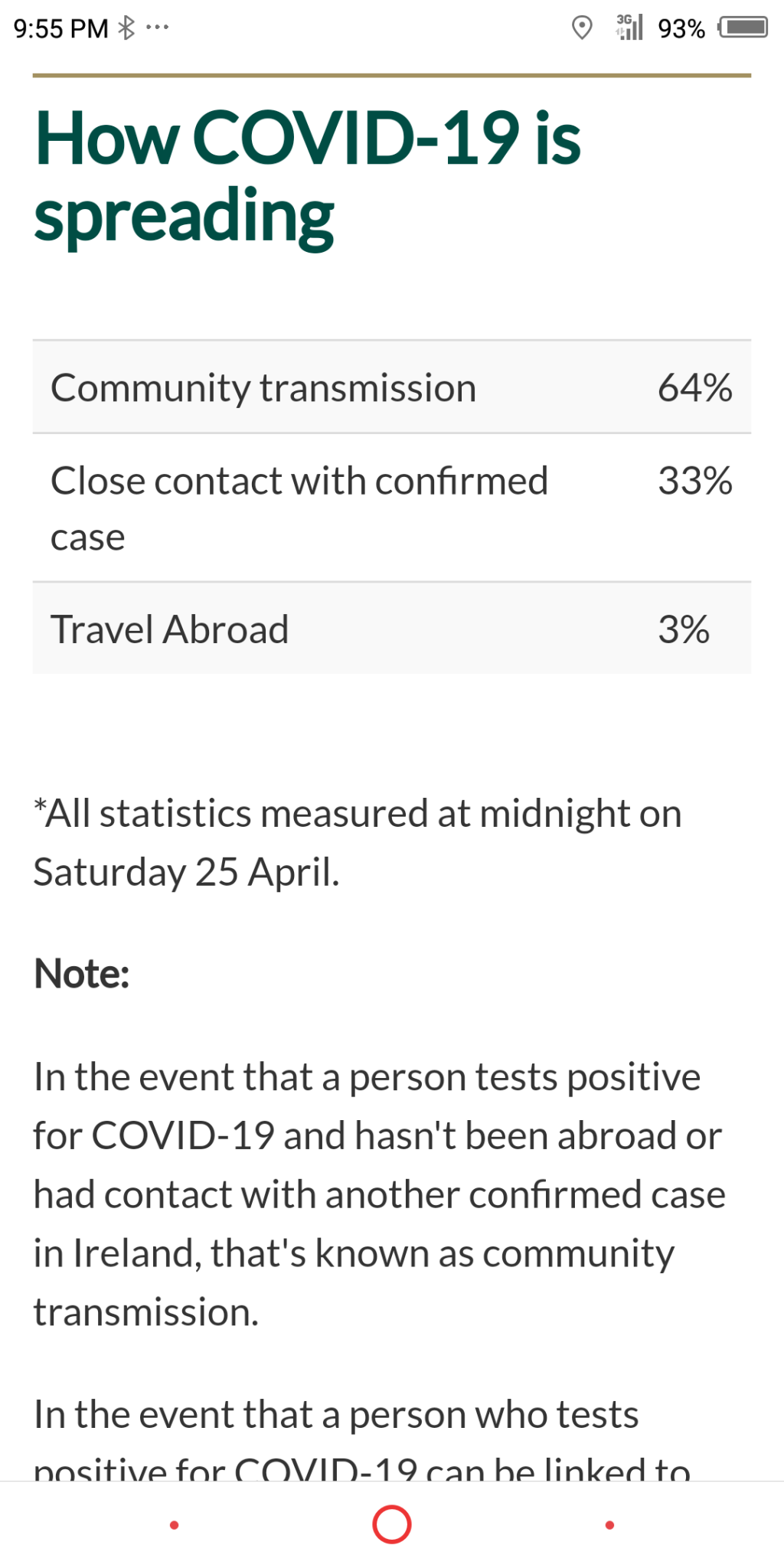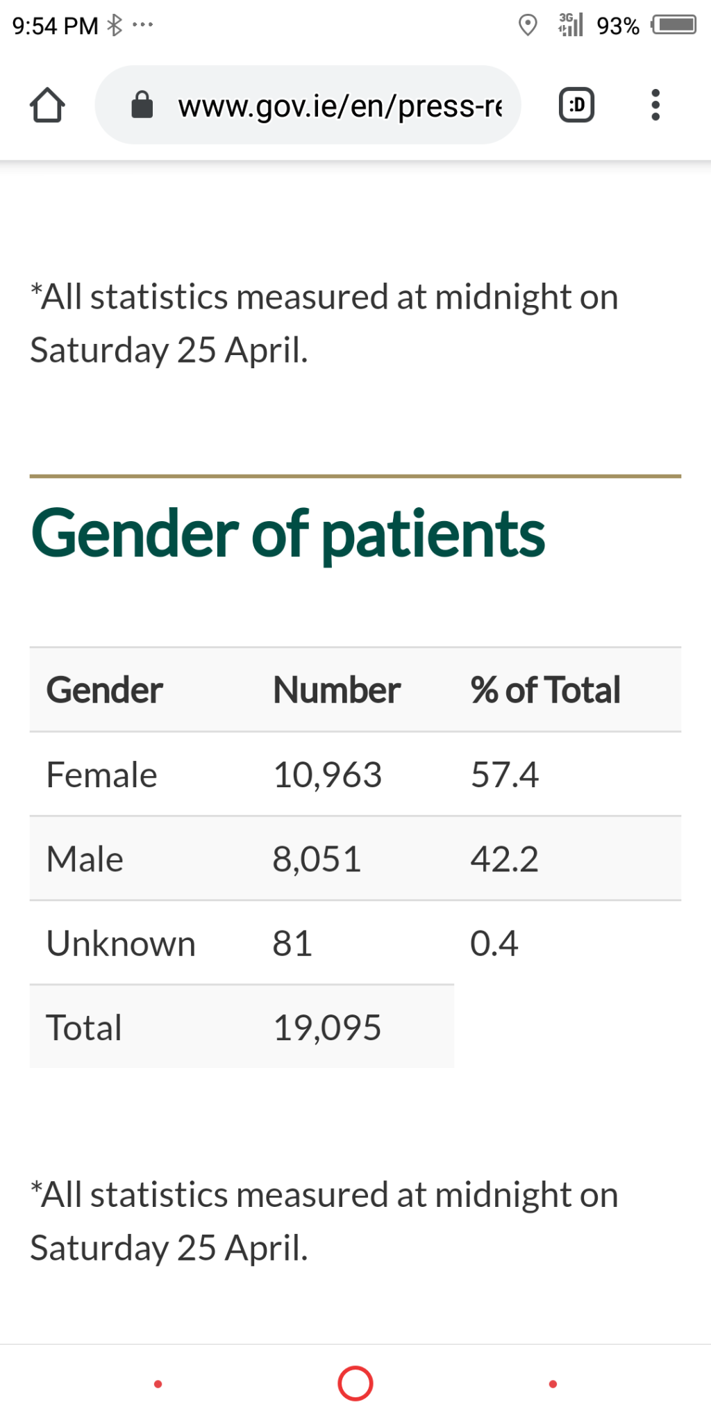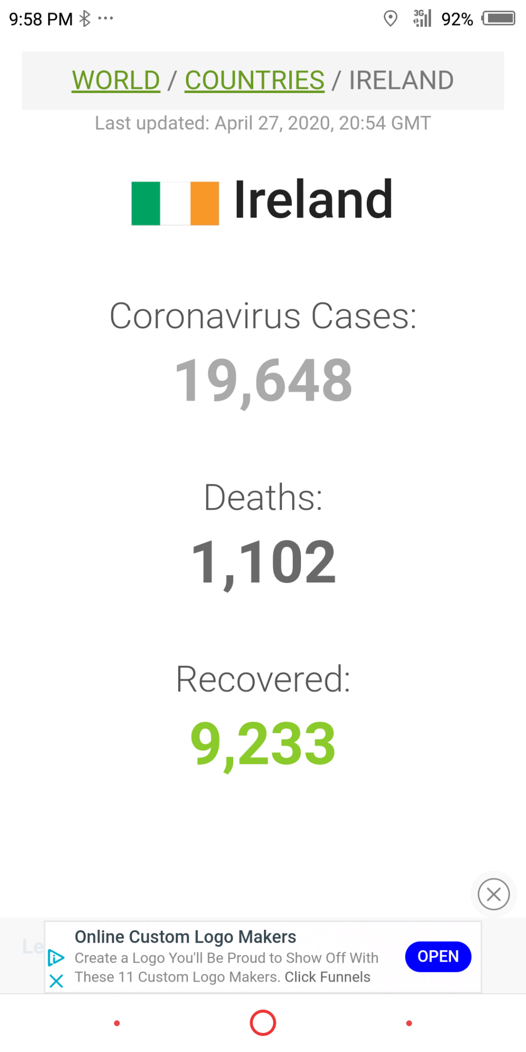 В Ирландия е 58-ми ден. Изглежда минахме пика и дневният брой на заразените и починалите започна да пада. Към днешна дата 19 648 заразени и 1102 починали. Малко статистика от 25.04. на който му е интересно.