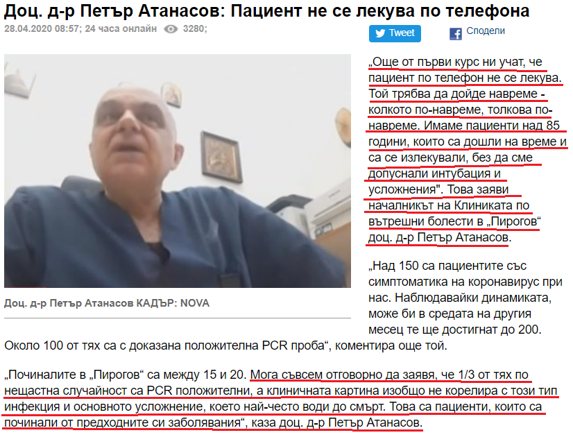 Браво на доц. Атанасов. Той е моя герой. Най-сетне някой да го каже направо в очите - ПО ТЕЛЕФОНА НЕ СЕ ЛЕКУВА и голяма част от починалите от корона вируса СА ПОЧИНАЛИ ОТ ОСНОВНИТЕ СИ ЗАБОЛЯВАНИЯ, А НЕ ОТ ВИРУСА. Нещо което нормално мислещите хора в темата постоянно повтаряме от месеци насам, но паникьорите и почитателите на оня гологлавия генерал постоянно отричат.