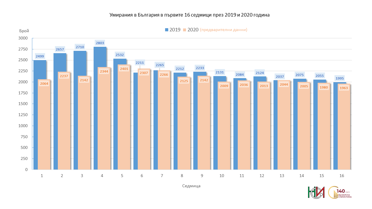 много интересна статистика! на око излиза, че тази година до момента смъртността е с около 2500 човека по-малко, което е близо 7%, с изключение на седмица в началото на февруари
