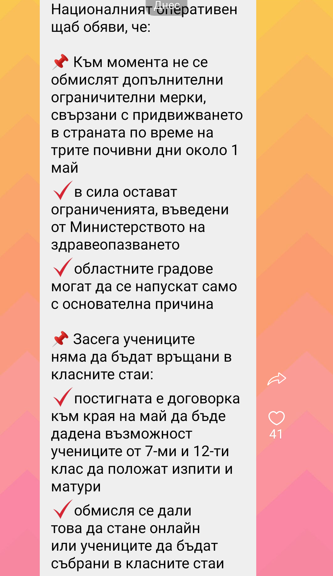 "Обсъждат се още мерки с хоризонт септември-октомври-ноември в абсолютно всички сфери, които сега за замрели, но това е нещо, което ще се обяви от правителството, не от нас“. - добри новини.
