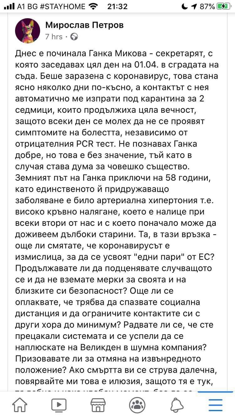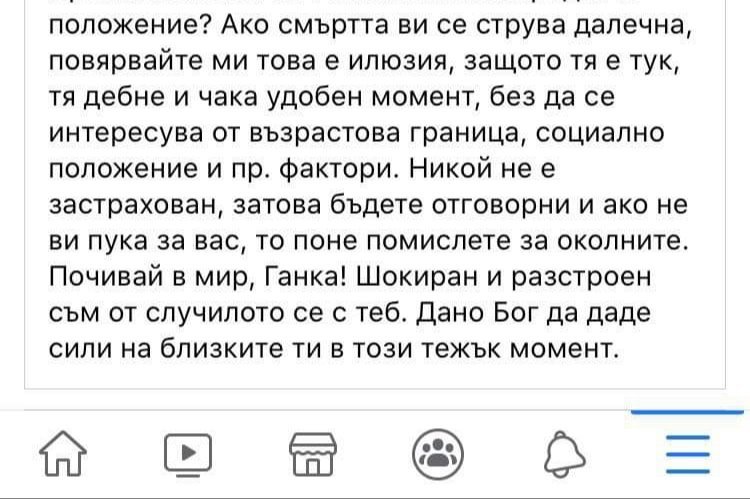 Без да разбирам от епидемиология си позволявам да твърдя, че нещо силно сбъркано има при нас относно начина, по който се организира посрещането и карантинирането на някои от пристигащите в България. С риск да бъда не особено политкоректна, смятам, че е редно властите да вземат нещата в свои ръце, тези хора да бъдат поставени под карантина така, че да не могат да заразят други, вместо да се разчита на съзнание и отговорност.