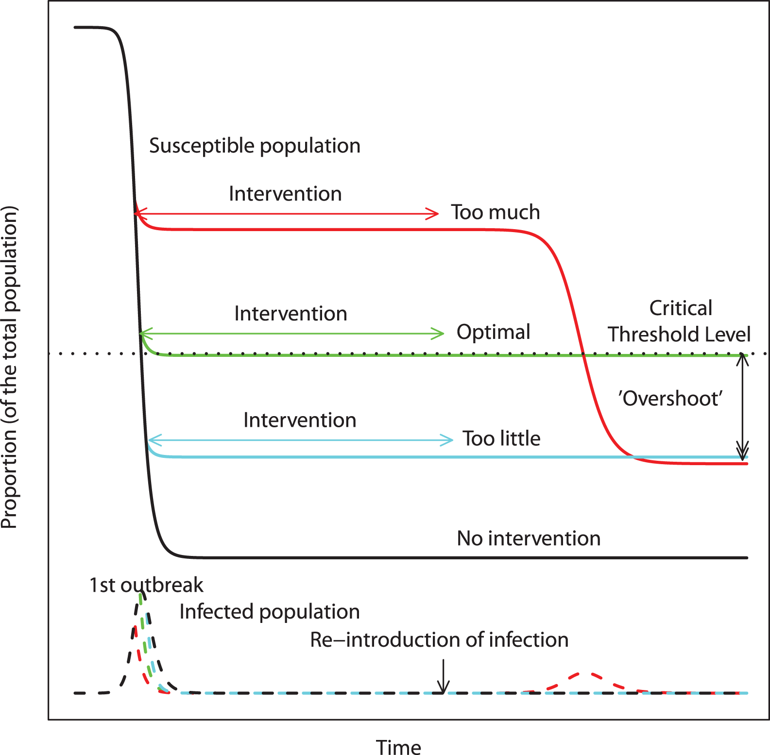 Иначе в съвременната епидемиологията груповият имунитет и ограничителните мерки не са взаимно изключващи, а допълващи се и целта на мерките е именно да не бъде сериозно надскочен (overshoot-нат) процента необходим за стаден имунитет. Контролиращи мерки в оптималния случай (зелена линия) освен, че не претоварват здравната система, не са нито прекалено строги, каквито биха позволили последващи вълни (червената линия), нито прекалено меки, при което биха се заразили много повече хора от необходимото (синята линия). От там нататък как се осъществява контролиране е сериозен въпрос и при такива ситуации проблемите с домовете за възрастните и болници веднага лъсват особено, когато е липсвала стратегия и са били занемарени и на практика са тиктакащи бомби от години. Това се видя и в Швеция, за което призна и Андерс Тегнел, който между другото не е казвал, че си е променил мнението за стратегията, каквито манипулации на жълти медии се разнасяха тук, а просто, че не се е главозамаял от това, че често го наричат "баща на нацията" и подхожда критично към всичко.