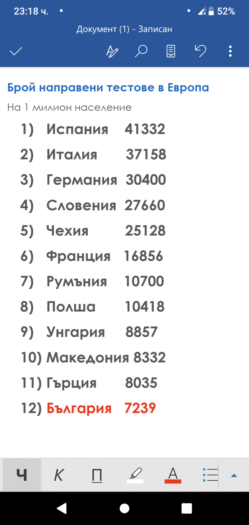 red_balloon Направих си труда да извадя статистика, къде сме ние в ЕС, по брой направени тестове на 1 милион население. Ти твърдеше, че не сме последни, но цифрите показват друго. Информацията е от Worldometer.