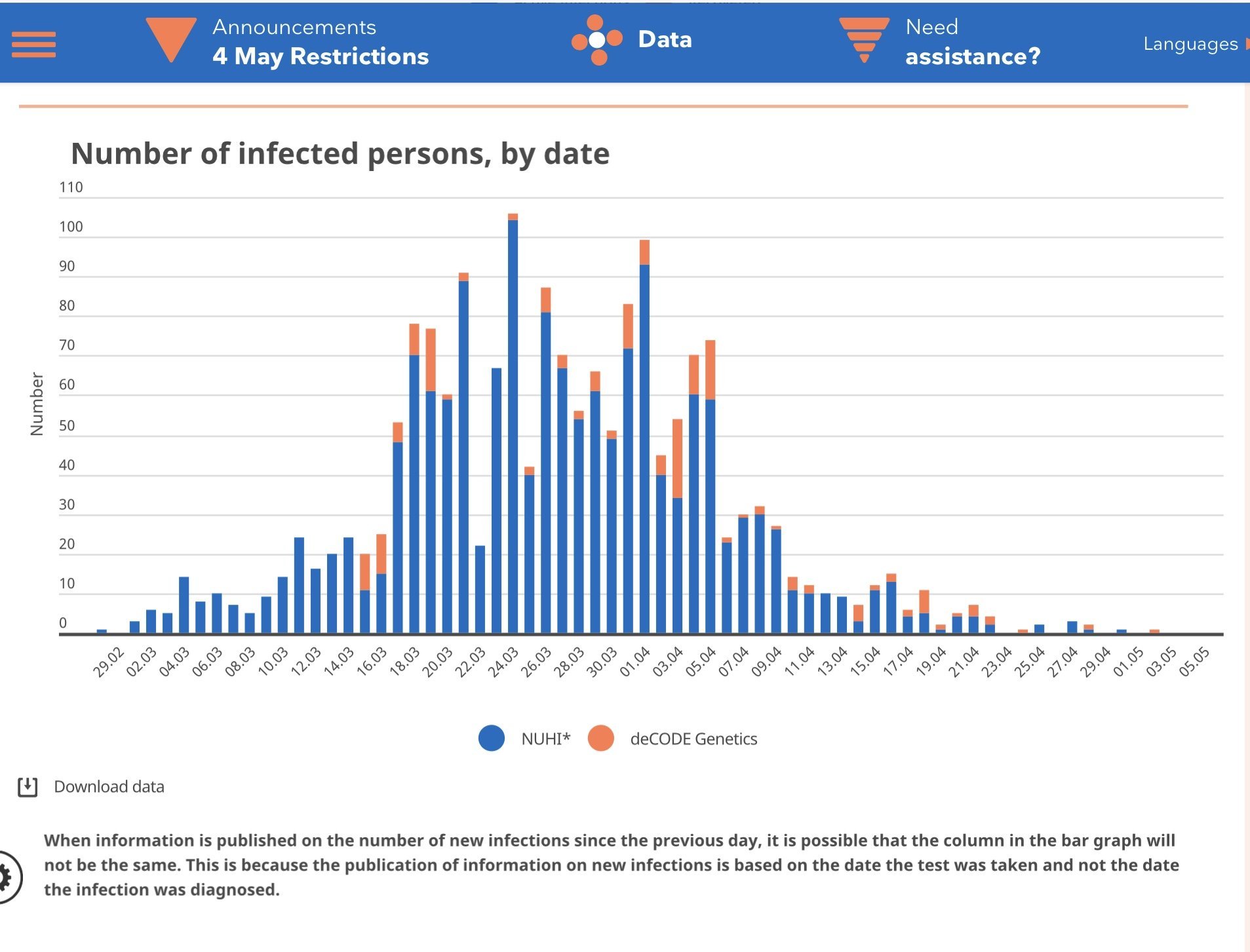 Нещата не са приключили, естествено. Две седмица са ни нужни, за да видим какъв ще е ефектът от вдигането на някои ограничения от онзи ден, 4 май: вдигане на бана за събиране от 20 на 50 души, нормално функциониране на училища и ДГ, следучилищни занимания и спорт за децата, отваряне на университети и професионални училища. Следващото разхлабване е предвидено за 18 май. Отваряне на басейните. (Това е нещо доста значимо и символично за исландците. Тук не кафета и ресторанти, а басейните са традицонното място за социализация.)