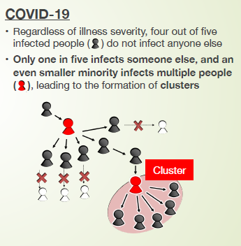 Независимо от тежестта на заболяването, 4 от 5 болни от ковид-19 не разпространяват болеста. Само 1 от 5 предава заразата на някой друг, а още по-рядко заразява голяма група други хора. По този начин ковид се разпространява на т.н. клъстъри. Предотвратяването на клъстърите, особено в началните етапи на епидемията е много важно за подтискане на вируса. Японците също така обръщат внимание на важността на т.н. ретроактивно проследяване, т.е. проследяване назад към някакъв общ източник - клъстър, от където най-вероятно идват много заразени и от там издирване на други хора, свързани с този клъстър.