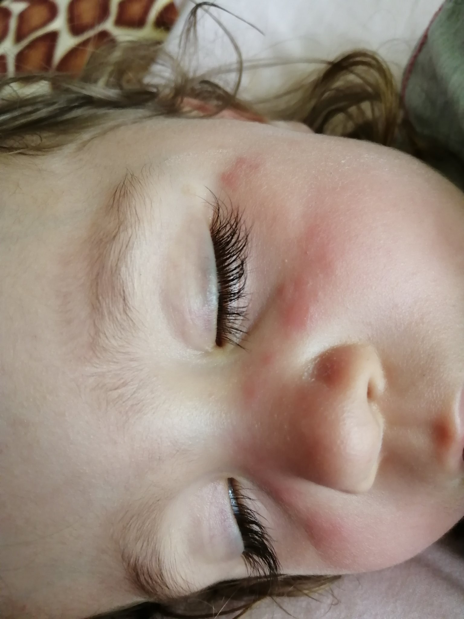 Може да е полазено от насекоми,големият ми син е имал същото по гърба и педиатъра ни каза полазено от насекомо , защо е като пътека по гърба при вас по лицето може да е от това Simple Smile Много са нежнички и веднага се изриват.