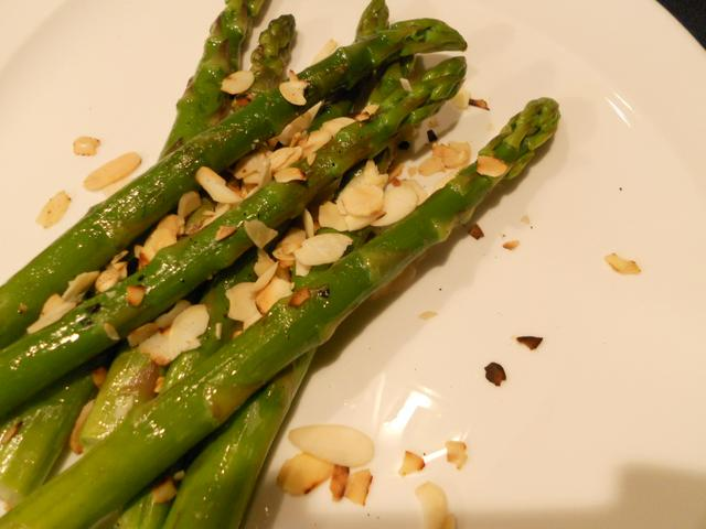 като гарнитура. Запечени аспержи с филиран бадем-