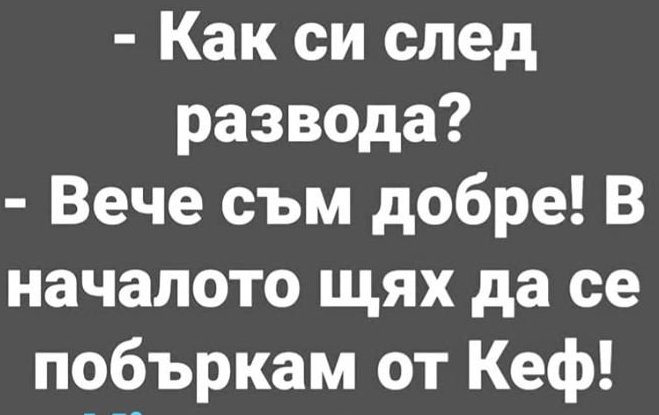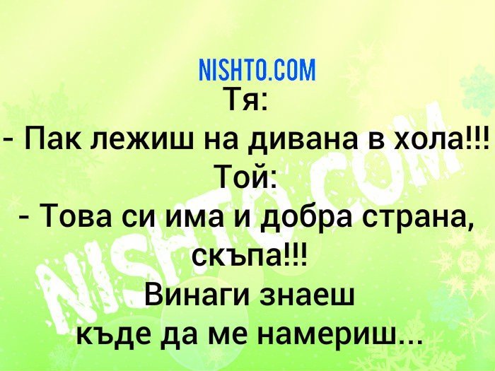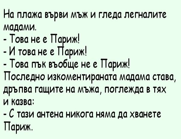 Мъж предлага на жена си: - Може днес да опитаме някоя нова поза? - Хайде! Например, ти ще застанеш пред мивката в кухнята, а аз ще легна на дивана в хола и ще включа телевизора.