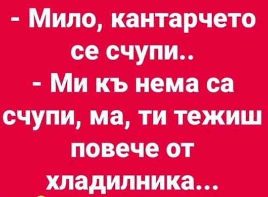 - Обещах вкъщи, че ще отслабна. И сега ям само нощем в кухнята, когато всички спят. А като светнат лампата, започвам панически да се крия...
