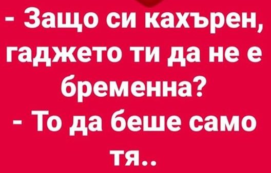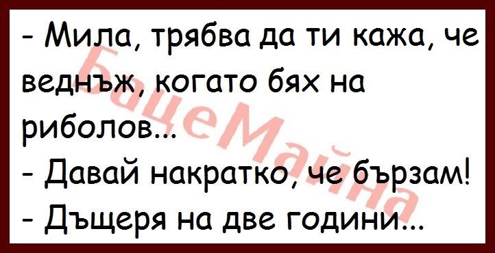 Един стар ерген решил да си направи майтап с приятелката си. Драснал една чертичка с фулмастер на тест за бременност. Гаджето му го взело и се усамотила в банята. Седи си той и чака реакция, за да се посмее и изведнъж:- Милооооо, какво означават три чертички?!