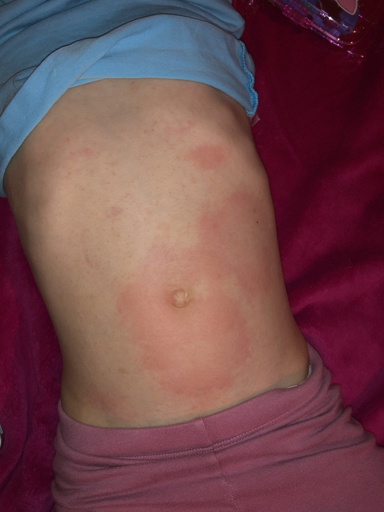 Здравейте д-р Митева. Дъщеря ми се изрина днес по коремчето изведнъж- прилагам снимка на обрива по-долу. Моля да ми кажете изисква ли според Вас спешна консултация този обрив. В началото я сърбеше, но след това съррбежът изчезна.