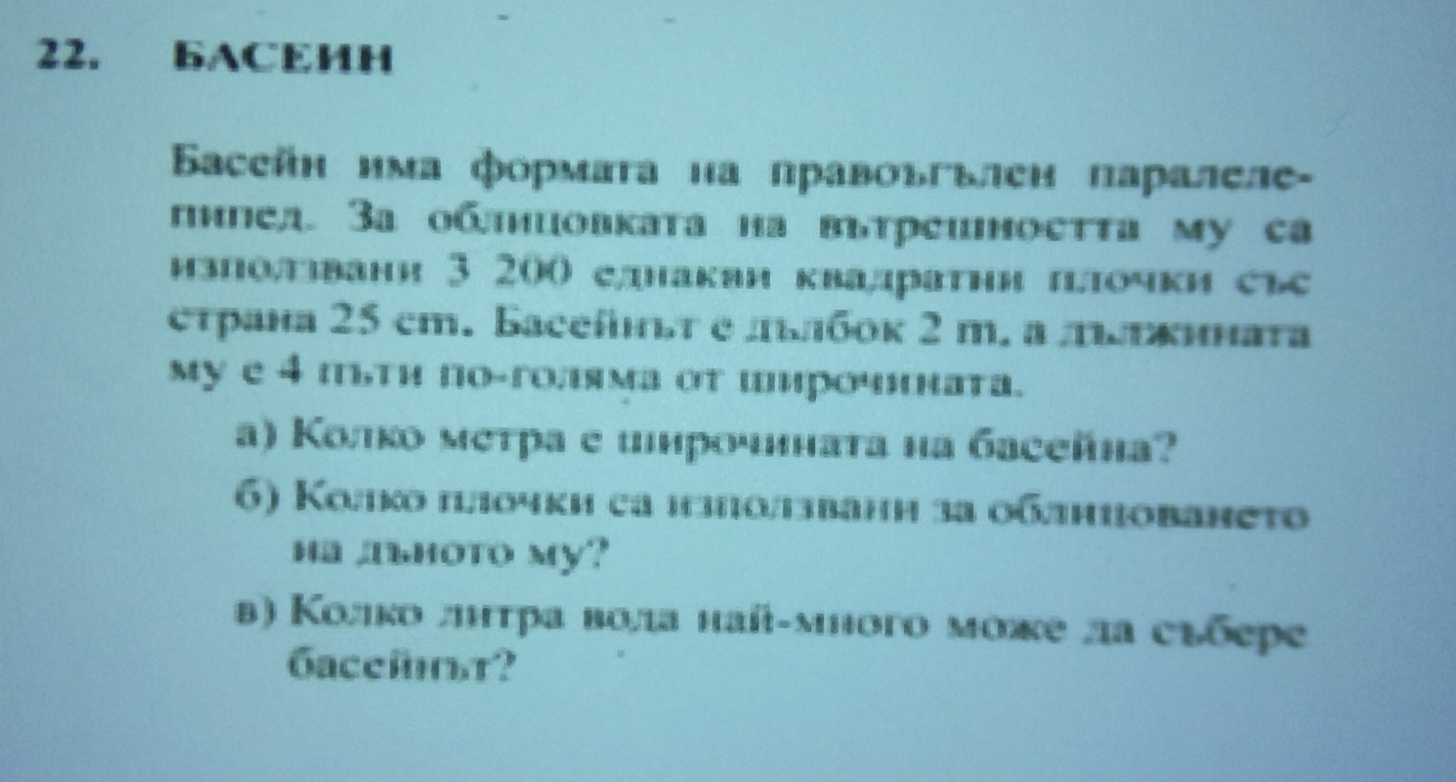 Повърхнината на всички плочки 0.25*0.25*3200=200 метра. С тях са облицовани дъното на басейна и стените му.