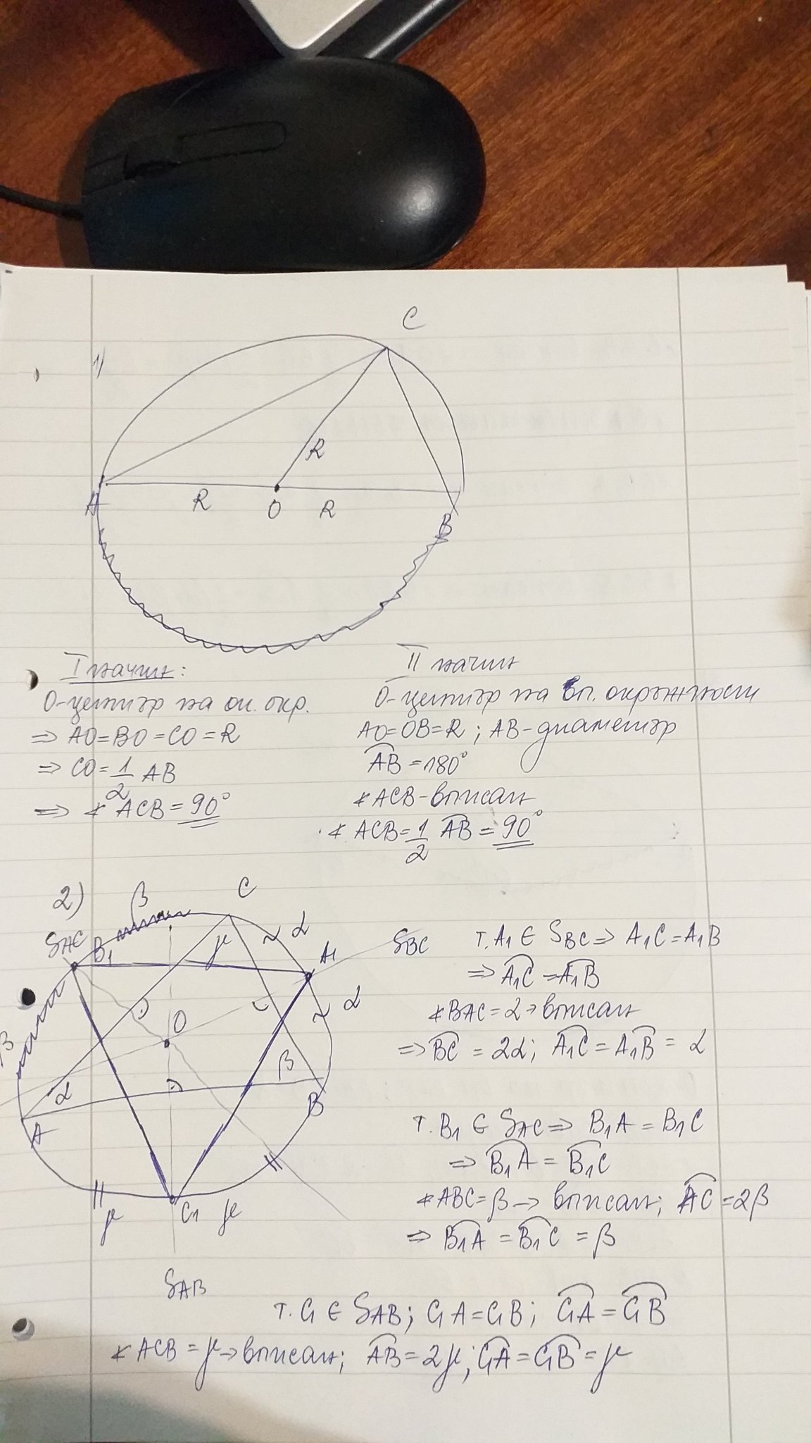 2)Около триъг.АВС с ъгли алфа, бета и гама е описана окръжност.Симетралите на страните ВС,СА,АВ пресичат принадлежащите на тези страни дъги съответно в точките А1, В1, С1. Намерете ъглите на триъг. А1В1С1